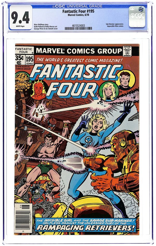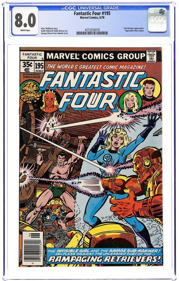 "Beware the Ravaging Retrievers!" Written by Marv Wolfman. Pencils by Keith Pollard. Inks by Pablo Marcos. Cover by George Perez and Joe Sinnott. Guest-starring the Sub-Mariner. Lights, Camera, Action! Susan Richards makes her acting debut in a movie being produced by the Sub-Mariner's film studio. Prince Namor joins the Invisible Girl on the set in an effort to get away from his troubles in Atlantis. However, with the cameras rolling, the Retrievers of Atlantis crash the set and grab the Avenging Son! The Invisible Girl and the Sub-Mariner join forces to escape the Retrievers! Cameo appearance by the Impossible Man. 36 pgs. Cover price $0.35.