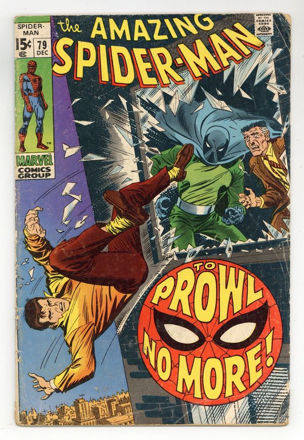 "To Prowl No More!" Part 2 of 2. Script by Stan Lee. Art by John Buscema (layouts) and Jim Mooney (finishes). Cover by John Romita. As shown on the frightening cover, Peter Parker falls out of J. Jonah Jameson's office window! But thanks to his ability to cling to surfaces...he survives! And after changing into his costume, Spider-Man welcomes the Prowler to the superhero vs. super-villain business! However during their fight, the web-slinger realizes that he and the Prowler have a lot in common. Perhaps there is a better way to resolve their conflict...and give Hobie Brown a fresh start. Cameo appearances by Gwen Stacy, J. Jonah Jameson, and Joe Robertson. (Notes: The Prowler returns in Amazing Spider-Man #87. This story was reprinted in Marvel Tales #60.) 36 pages. Cover price $0.15.