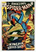 Ends Feb 2 7:13 PM CST Bid History 3 bids Current Bid $16 Your Secret Max Bid If you'd like to bid, please log in or register. "The Kingpin Strikes Back!" Part 2 of 3. Script by Stan Lee. Art by John Romita (layouts), John Buscema (pencils), and Jim Mooney (inks). Cover by John Romita. The Kingpin has grown tired of sitting on the sidelines. So he prepares to strike back against the Schemer! But the Schemer beats the big crime boss to the punch and invades Wilson Fisk's palatial manor! Once inside he confronts the Kingpin...and then he sees Vanessa Fisk -- the Kingpin's wife! The tension in the room could be cut with a knife...until the web-slinger crashes thru the window! And as shown on the brilliant cover, the wall-crawler and the Kingpin wage war in the mansion...while the Schemer deftly slips away. Both Spider-Man and the Kingpin will be left empty-handed on this night. Cameo appearances by Captain Stacy and Gwen Stacy. (Note: This story was reprinted in Marvel Tales #65.) 36 pages. Cover price $0.15.