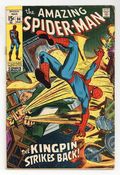 "The Kingpin Strikes Back!" Part 2 of 3. Script by Stan Lee. Art by John Romita (layouts), John Buscema (pencils), and Jim Mooney (inks). Cover by John Romita. The Kingpin has grown tired of sitting on the sidelines. So he prepares to strike back against the Schemer! But the Schemer beats the big crime boss to the punch and invades Wilson Fisk's palatial manor! Once inside he confronts the Kingpin...and then he sees Vanessa Fisk -- the Kingpin's wife! The tension in the room could be cut with a knife...until the web-slinger crashes thru the window! And as shown on the brilliant cover, the wall-crawler and the Kingpin wage war in the mansion...while the Schemer deftly slips away. Both Spider-Man and the Kingpin will be left empty-handed on this night. Cameo appearances by Captain Stacy and Gwen Stacy. (Note: This story was reprinted in Marvel Tales #65.) 36 pages. Cover price $0.15.