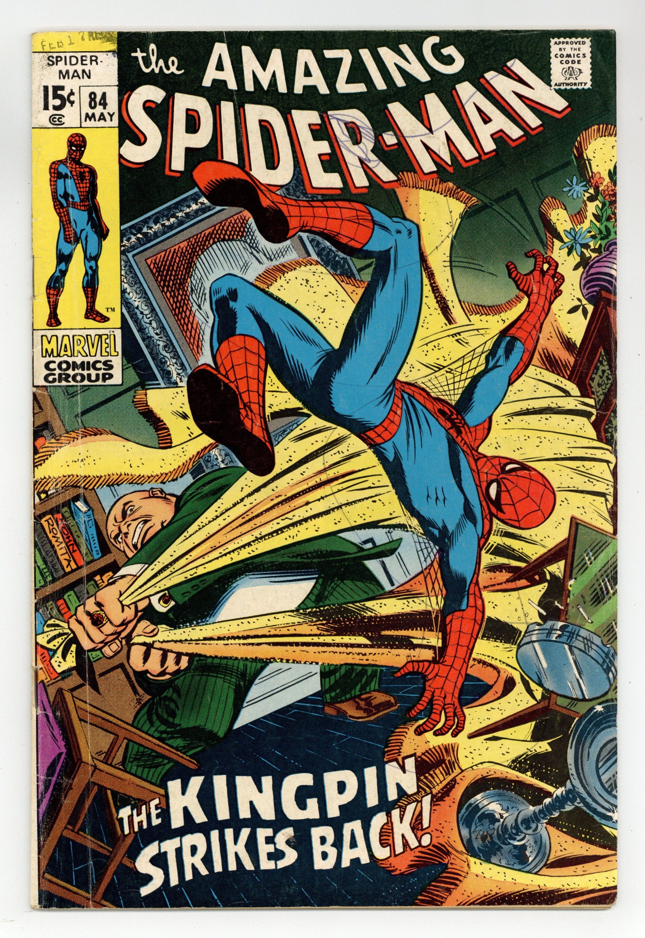 Starts Feb 2 "The Kingpin Strikes Back!" Part 2 of 3. Script by Stan Lee. Art by John Romita (layouts), John Buscema (pencils), and Jim Mooney (inks). Cover by John Romita. The Kingpin has grown tired of sitting on the sidelines. So he prepares to strike back against the Schemer! But the Schemer beats the big crime boss to the punch and invades Wilson Fisk's palatial manor! Once inside he confronts the Kingpin...and then he sees Vanessa Fisk -- the Kingpin's wife! The tension in the room could be cut with a knife...until the web-slinger crashes thru the window! And as shown on the brilliant cover, the wall-crawler and the Kingpin wage war in the mansion...while the Schemer deftly slips away. Both Spider-Man and the Kingpin will be left empty-handed on this night. Cameo appearances by Captain Stacy and Gwen Stacy. (Note: This story was reprinted in Marvel Tales #65.) 36 pages. Cover price $0.15.