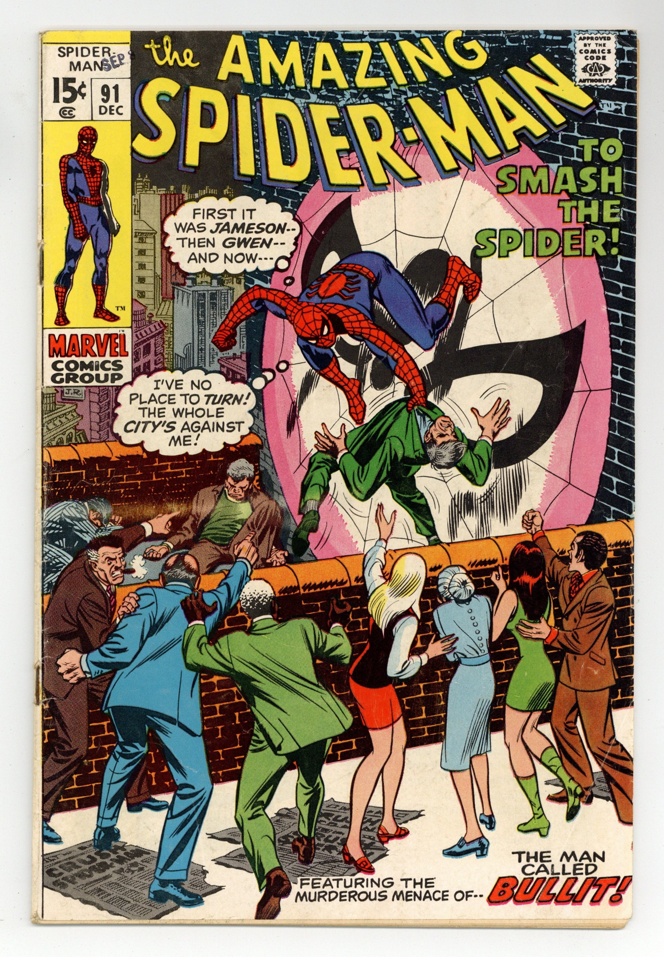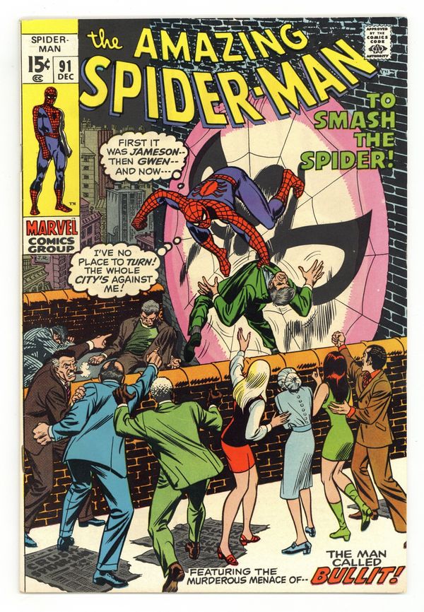 Tags: Marvel Legacy Numbering: Amazing Spider-Man (part 91), Spider-Man$46.00"To Smash A Spider!" Part 1 of 2. Script by Stan Lee. Pencils by Gil Kane. Inks by John Romita. Cover by John Romita. The family and friends of Captain George Stacy are in a state of disbelief following his tragic death. And after his funeral, the blame game for his demise begins in earnest. Gwen blames Spider-Man. And of course J. Jonah Jameson does too. A sleazy political rival of Captain Stacy -- named Sam Bullit -- takes advantage of the situation by starting a political campaign centered on capturing Spider-Man. And to make matters worse...Gwen volunteers to work on the campaign! What in the world can Peter Parker do...to save both his reputation and his relationship? Cameo appearances by Joe Robertson and Harry Osborn. (Note: This story was reprinted in Marvel Tales #72.) 36 pages. Cover price $0.15.