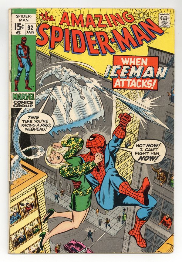 Tags: Marvel Legacy Numbering: Amazing Spider-Man (part 92), Spider-Man$47.00"When Iceman Attacks" Part 2 of 2. Guest-starring Iceman. Script by Stan Lee. Pencils by Gil Kane. Inks by John Romita and Tony Mortellaro (backgrounds). Cover by John Romita. In a surprising move, Spider-Man absconds with Gwen Stacy to keep her away from the deceitful Sam Bullit. The web-slinger would never harm his dear girlfriend, but a young man standing on the sidewalk named Bobby Drake doesn't know that. So when Iceman (of the original X-Men) sees Gwen in apparent distress, he zooms to the rescue! However the wall-crawler doesn't have time to fight Iceman, because he's just watched Sam Bullit's goons abduct Joe Robertson! Can the web-slinger convince Iceman to fight with him instead of against him? Robbie's life depends on it! Cameo appearance by J. Jonah Jameson. (Notes: Marie Severin designed the preliminary cover. This story was reprinted in Marvel Tales #73.) 36 pages. Cover price $0.15.
