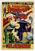 $33.50"Enter: Dr. Strange!" Part 2 of 2. Guest-starring Doctor Strange. Script by Stan Lee. Pencils by John Romita. Inks by John Romita and Tony Mortellaro (backgrounds). Cover by John Romita. The web-slinger frantically swings through the city trying to pick up a signal from his spider tracer! The amazing one tossed the tracer on the tall man who abducted Flash last issue. So, find the tracer...find Flash! But instead, Spider-Man picks up a message from the Master of the Mystic Arts! Somehow Dr. Strange knows were Flash has been taken. The duo rushes to the location, and the battle to rescue Flash begins! Cameo appearances by Gwen Stacy, Harry Osborn, Aunt May, and Sha Shan. (Notes: Spider-Man and Dr. Strange meet again in Marvel Team-Up #21. This story was reprinted in Marvel Tales #88.) 36 pages. Cover price $0.20.