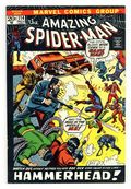 "Gang War, Shmang War! What I Want to Know Is...Who the Heck is Hammerhead?" Part 2 of 3. Script by Gerry Conway. Art by Jim Starlin (breakdowns), John Romita (finishes), and Tony Mortellaro (backgrounds). Cover by John Romita. The wondrous wall-crawler is caught in the middle of a gang war between Doctor Octopus and Hammerhead! Spider-Man doesn't know who the new crime boss is, but he inadvertently helps him by knocking out Doc Ock! Hammerhead is so impressed that he offers the web-spinner a chance to join his organization. However, there's no way Spider-Man would accept the offer...unless it would lead to finding Aunt May! What does Hammerhead know about May Parker's whereabouts? All roads lead north to Westchester for next issue's blockbuster finale! Origin of Hammerhead. First appearance (flashback cameo) of Dr. Jonas Harrow. Cameo appearances by Aunt May, Gwen Stacy, Flash Thompson, and Professor Miles Warren. (Notes: John Romita is credited as a co-plotter. This issue was reprinted in Marvel Tales #93.) 36 pages. Cover price $0.20.