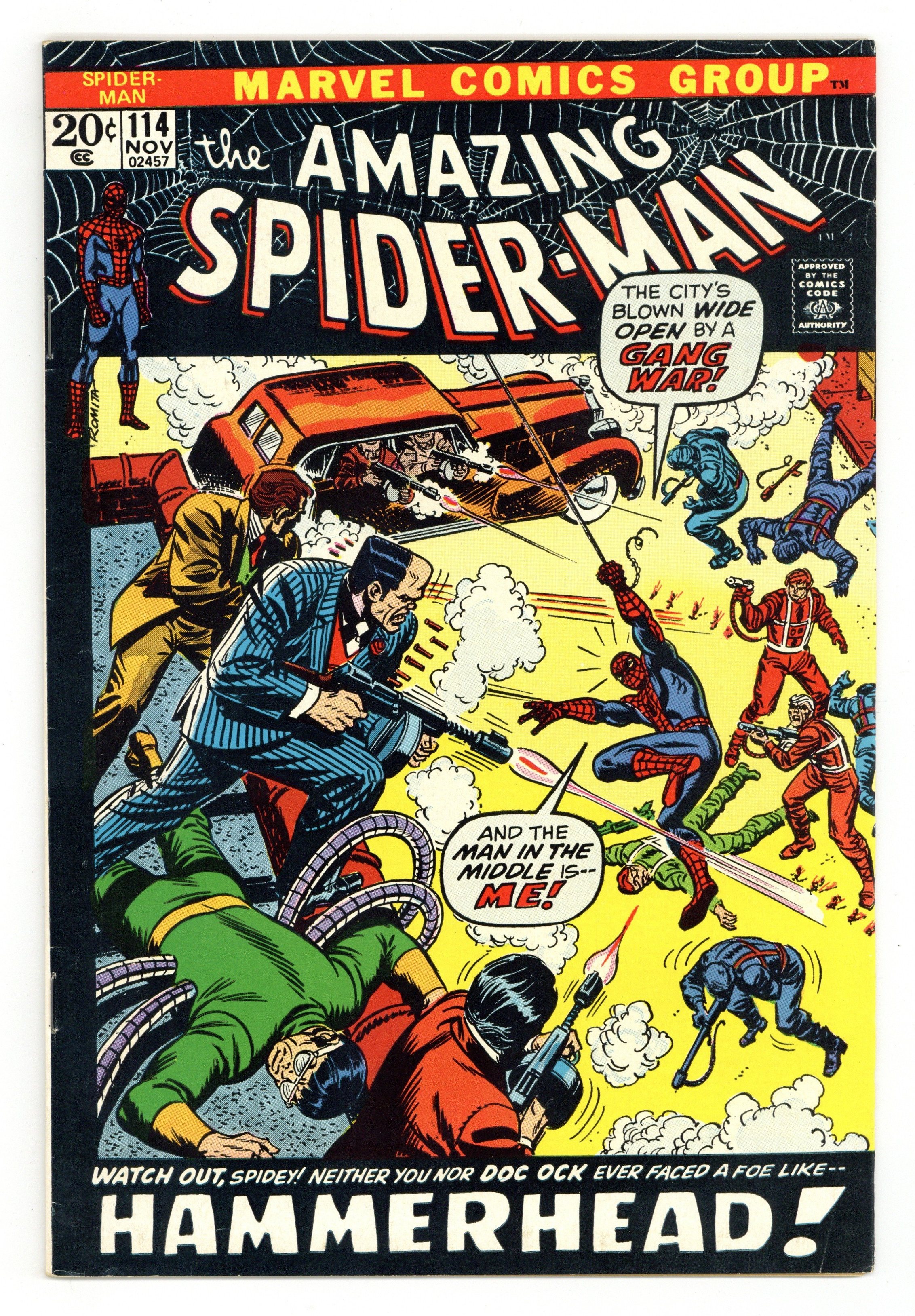 Tags: Marvel Legacy Numbering: Amazing Spider-Man (part 114), Spider-Man$23.50"Gang War, Shmang War! What I Want to Know Is...Who the Heck is Hammerhead?" Part 2 of 3. Script by Gerry Conway. Art by Jim Starlin (breakdowns), John Romita (finishes), and Tony Mortellaro (backgrounds). Cover by John Romita. The wondrous wall-crawler is caught in the middle of a gang war between Doctor Octopus and Hammerhead! Spider-Man doesn't know who the new crime boss is, but he inadvertently helps him by knocking out Doc Ock! Hammerhead is so impressed that he offers the web-spinner a chance to join his organization. However, there's no way Spider-Man would accept the offer...unless it would lead to finding Aunt May! What does Hammerhead know about May Parker's whereabouts? All roads lead north to Westchester for next issue's blockbuster finale! Origin of Hammerhead. First appearance (flashback cameo) of Dr. Jonas Harrow. Cameo appearances by Aunt May, Gwen Stacy, Flash Thompson, and Professor Miles Warren. (Notes: John Romita is credited as a co-plotter. This issue was reprinted in Marvel Tales #93.) 36 pages. Cover price $0.20.