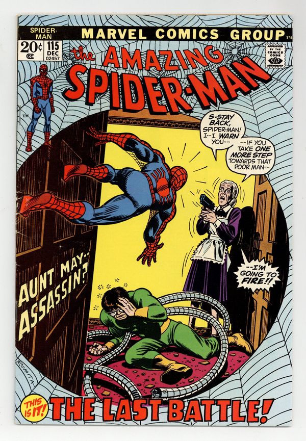 Tags: Marvel Legacy Numbering: Amazing Spider-Man (part 115), Spider-Man$55.00"The Last Battle!" Part 3 of 3. Script by Gerry Conway. Art by John Romita and Tony Mortellaro (backgrounds). Cover by John Romita. It's a wild shootout in Westchester as the gang war between Hammerhead and Dr. Octopus reaches its conclusion! And amidst the raging gun battle, Spider-Man finds Aunt May! But shockingly, Aunt May has thrown in with Doc Ock! So while dodging Doctor Octopus' arms and Hammerhead's bullets, the web-slinger has to make sure -- he doesn't get clipped by his dear aunt! In the meantime, the Daily Bugle learns about the firefight in Westchester; andJoe Robertson, Ned Leeds, and Gwen Stacy drive to the scene! Can your friendly neighborhood Spider-Man defeat two super-villains -- and save his Aunt May -- in one fell swoop? What a finish! Cameo appearances by J. Jonah Jameson and Betty Brant. (Notes: John Romita is credited as aco-plotter. Hammerhead and Dr. Octopus return in Amazing Spider-Man 130. This issue is reprinted in Marvel Tales #94.) 36 pages. Cover price $0.20.