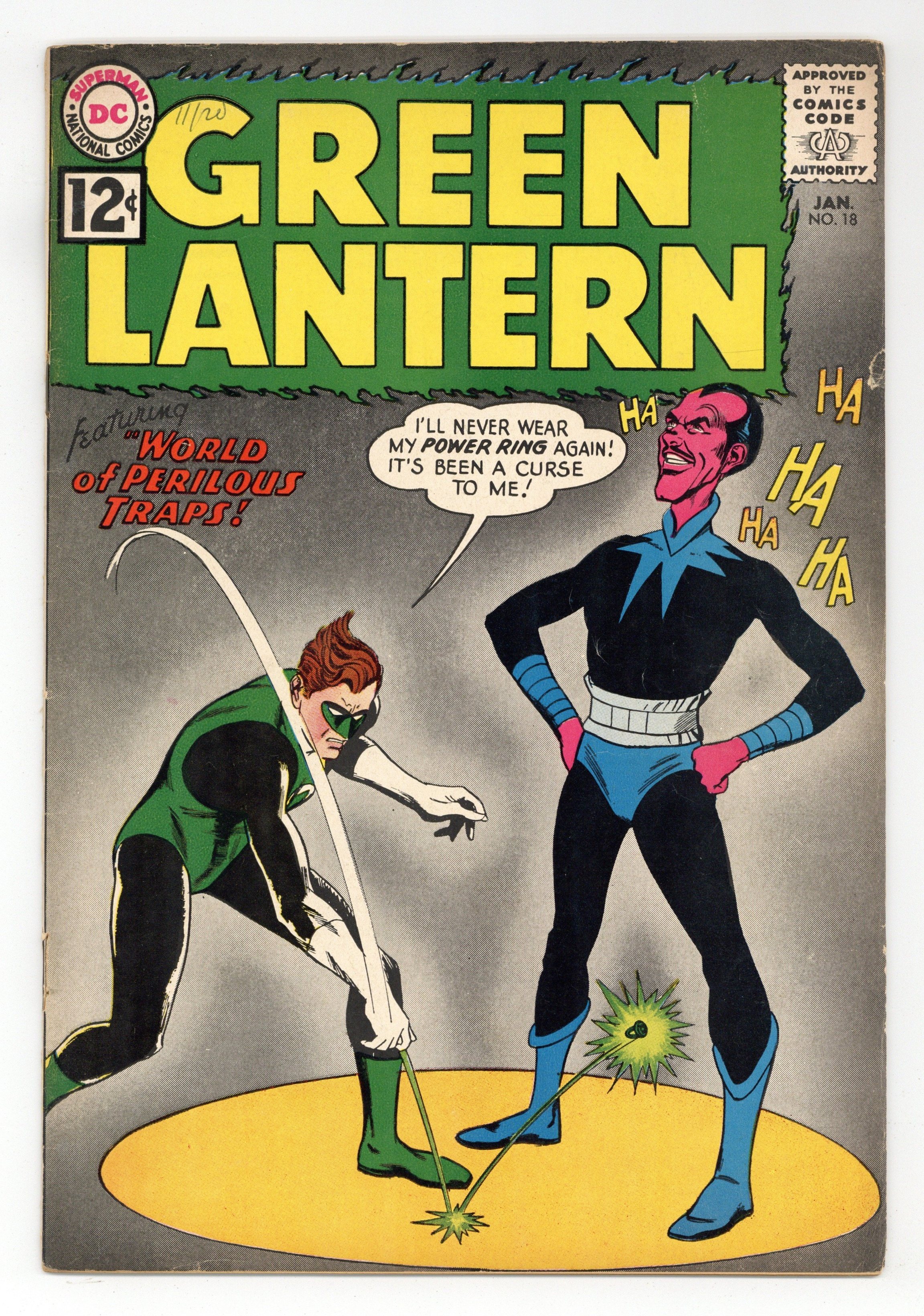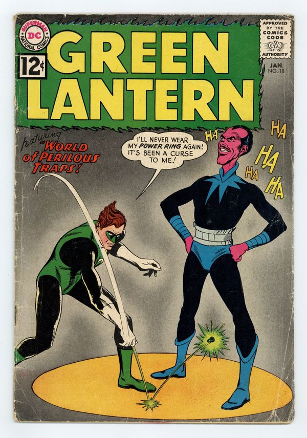 Cover pencils by Gil Kane, inks by Joe Giella. World of Perilous Traps!, script by John Broome, pencils by Gil Kane, inks by Joe Giella; In their last encounter, Sinestro implanted a telpathic command into Hal Jordan's mind, which causes him to release Sinestro from his imprisonment; Sinestro then transports Hal to Qward for a battle, where Hal tricks him into thinking he no longer has his Green Lantern Ring and then imprisons Sinestro again. Touchdown for Picasso! public service announcement, script by Jack Schiff, art by Sheldon Moldoff. Green Lantern Vs. Power Ring!, script by John Broome, pencils by Gil Kane (pencils pages 1-6; layouts pages 7-12) and Mike Sekowsky (pencils pages 7-12) inks by Joe Giella; During a series of distance control tests, Bill Baggett finds Hal Jordans ring and uses it for destruction before Hal overcomes him through willpower and regains the ring. 32 pgs. $0.12. Cover price $0.12.