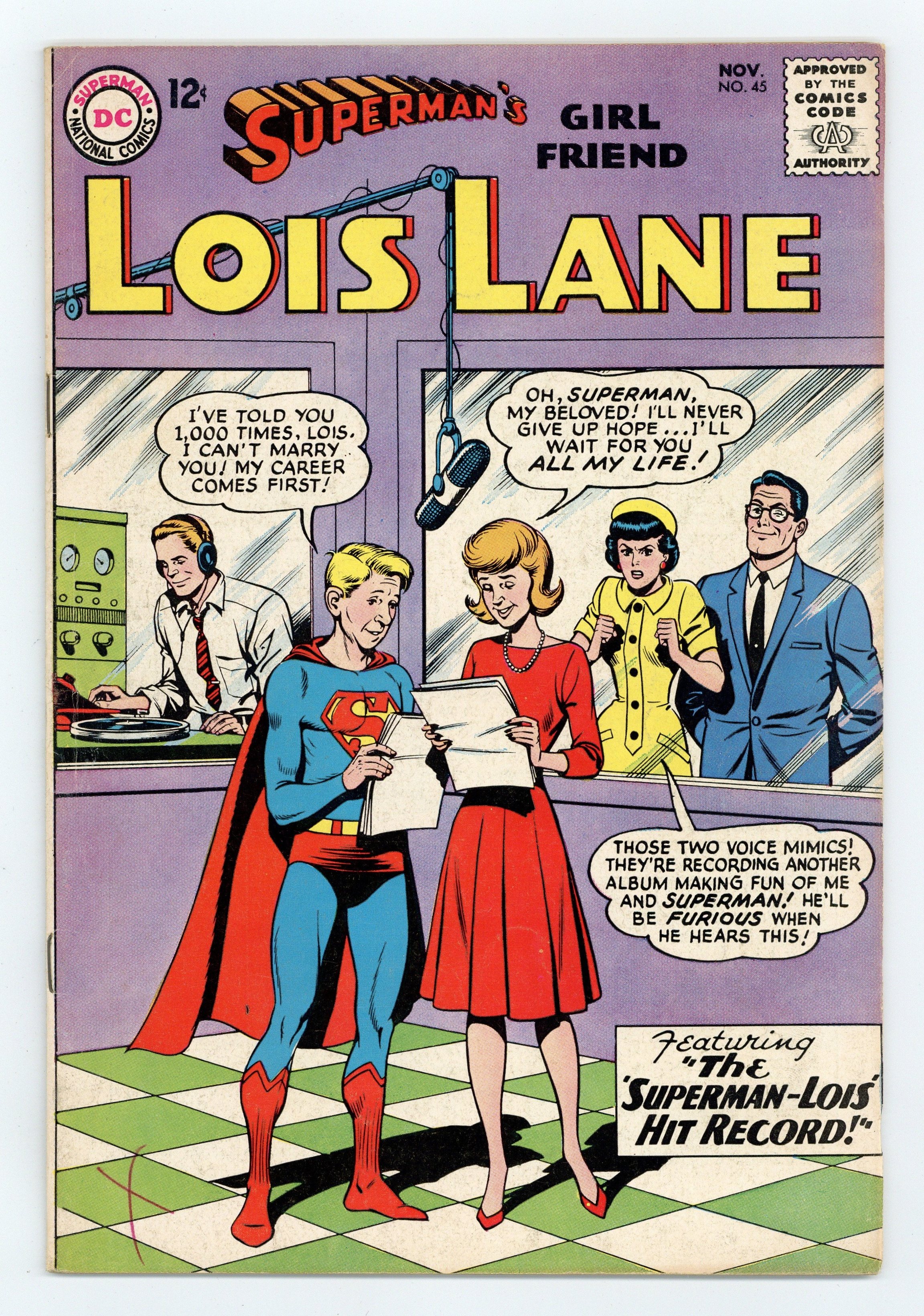 Cover art by Kurt Schaffenberger. Your United Nations at Work/From the Files of the World Health Organization, script by Jack Schiff, art by Sheldon Moldoff. The "Superman-Lois" Hit Record!, script by Jerry Siegel, pencils by Curt Swan, inks by George Klein and Kurt Schaffenberger (Lois Lane heads); Lois is furious when a novelty record mocking her relationship with Superman becomes a giant hit. House ad for Flash Annual #1. The Girl with the Golden Arm!, art by Kurt Schaffenberger; Lois goes on a crusade against gambling, but starts to win big money in Ace Bower's casino, which leads to an underworld attempt on her life. "Dear Dr. Cupid!", art by Kurt Schaffenberger; Lois gets a new assignment to replace the "Advise-the-Lovelorn" columnist, who has broken her leg. Subscription ad for The Brave and the Bold, now featuring hero team-ups, includes cover art by George Roussos from issue #50. 36 Pages, Full Color. Cover price $0.12.