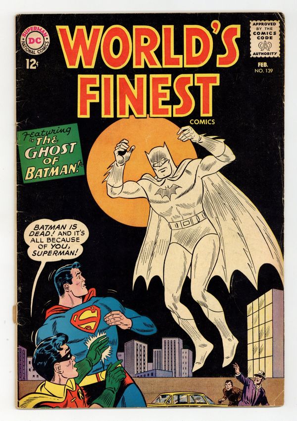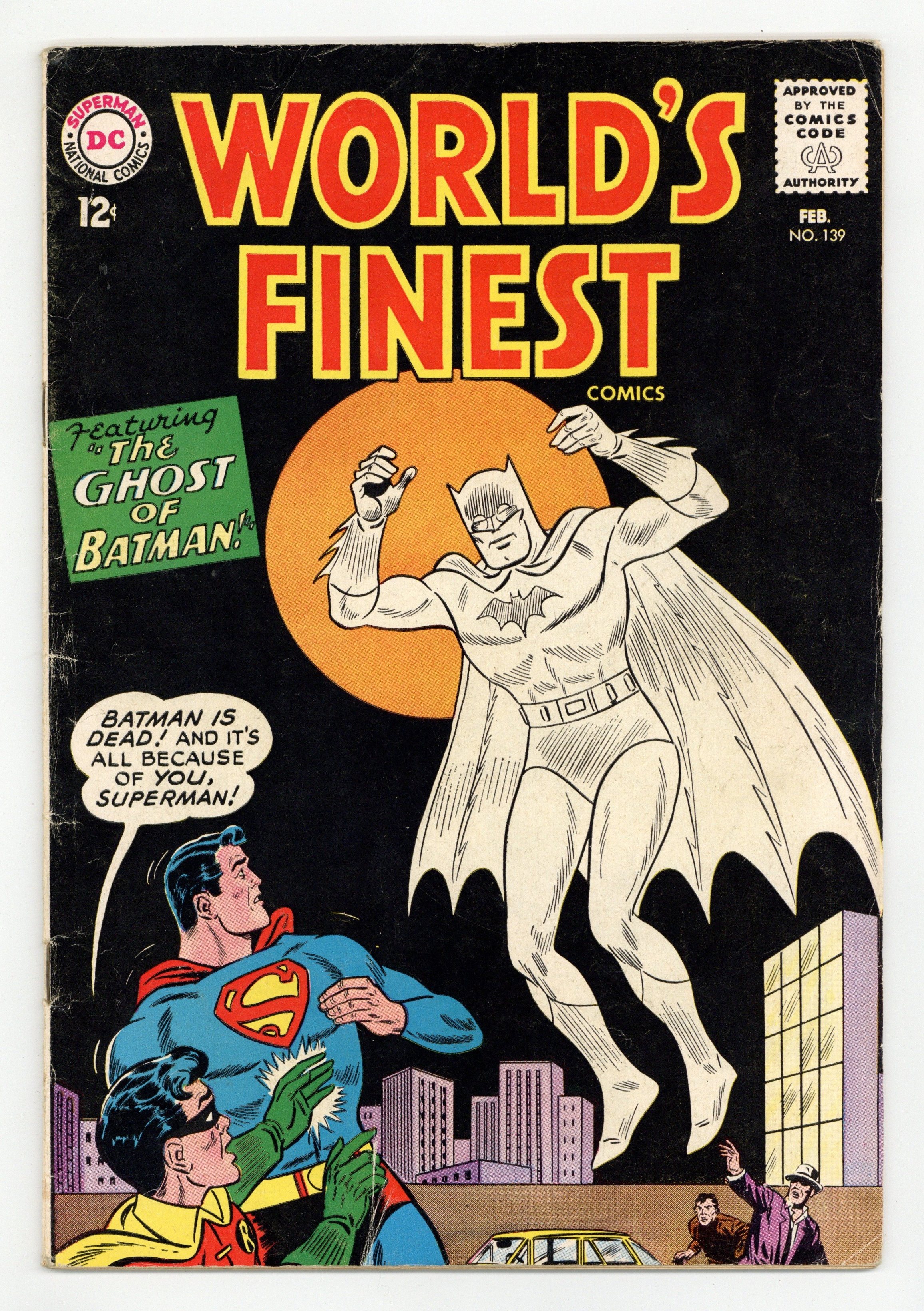 $20.50Cover pencils by Dick Dillin, inks by Sheldon Moldoff. The Ghost of Batman starring Superman and Batman, script by Dave Wood, pencils by Jim Mooney, inks by Sheldon Moldoff; Criminals seem to assasinate Batman while Superman is disguised as him; Now they can't reveal Batman is still alive without revealing his true identity. Special Christmas Quiz -- "Christmas in Many Lands!" public service announcement, script by Jack Schiff, art by Ruben Moreira. Ollie humor page by Henry Boltinoff. The Doom Hunters starring Aquaman, script by Jack Miller, art by Ramona Fradon. 36 Pages, Full Color. Cover price $0.12.