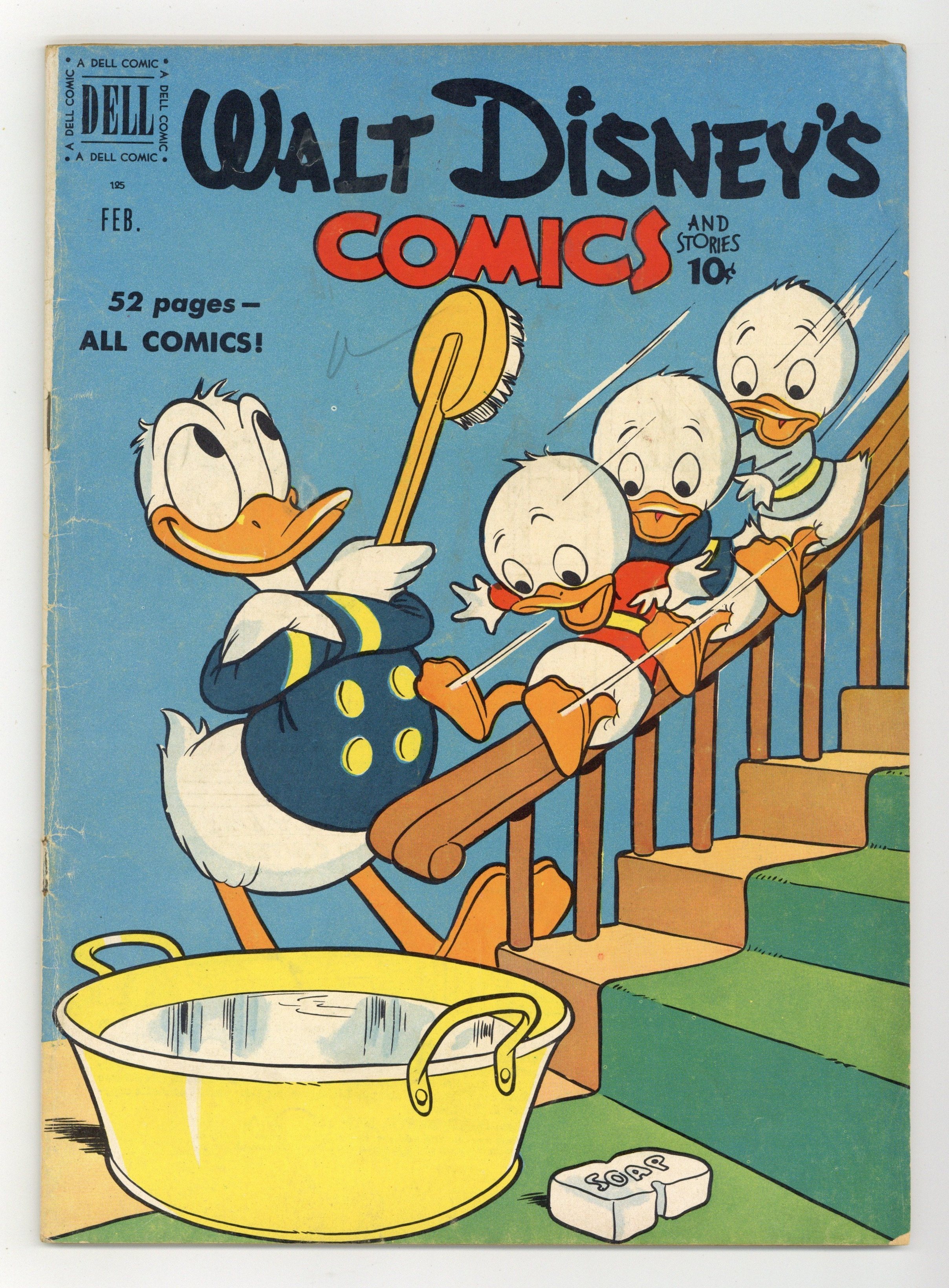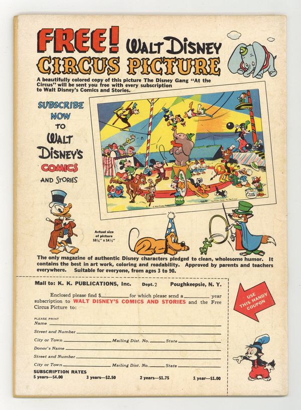 Cover by Bob Grant. Stories and art by Carl Barks, Floyd Gottfredson, Merrill De Maris, Bill Walsh, Manuel Gonzales, Bob Karp, Gil Turner, Bob Moore, George Waiss, Bill Wright, and Al Taliaferro. Sometimes listed as Vol. 11 #5. The long-running vehicle for Disney character comics featured art by Carl Barks, the legendary Good Duck Artist. In a classic story from the Mickey Mouse comic strip, Mickey's old foe Pete interferes in the plan to save the old whaling boat. In a story by Barks that introduces the Junior Woodchucks, Huey, Dewey and Louie enter their St. Bernard in a wilderness test. When Grandma Duck's cow gives cream instead of milk, Uncle Scrooge and Pete hatch a crooked plan. Donald Duck; Grandma Duck; Li'l Bad Wolf; Mickey Mouse; A Foxy Resolution; Mickey Mouse: Mighty Whale Hunter. 48 pages, Full Color. Cover price $0.10.