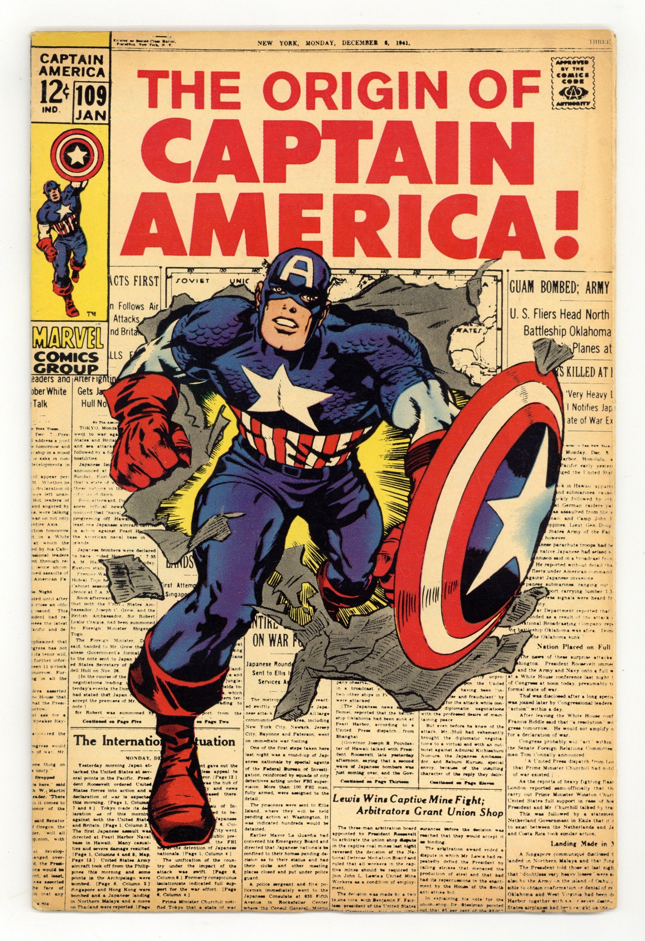 1st printing. Cover pencils by Jack Kirby, inks by Syd Shores . "The Hero That Was!", script by Stan Lee, pencils by Jack Kirby, inks by Syd Shores; Captain America tells Nick Fury his origin, and about how guilty he is over Buckys death; During WWII, Steve Rogers applied for the military, but couldnt pass the physical; He enters a program and is given super soldier formula, which makes him bigger and stronger; Cap battles a Nazi. Letter to the editor from comics writer Don McGregor. NOTE: JC Penney reprint exists with a Stridex ad on the back cover and Marvel Legends AF reprint exists with Red/White Marvel logo in the bottom right corner of front cover. 36 pgs., full color. $0.12. Cover price $0.12.