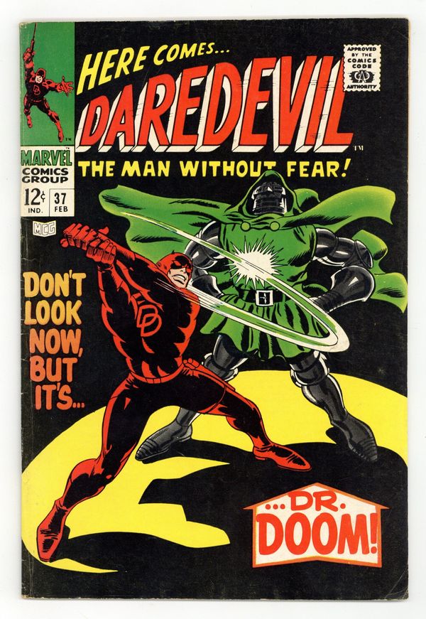 Tags: Marvel Legacy Numbering: Daredevil (part 37), Daredevil$29.00Cover pencils by Gene Colan, inks by Frank Giacoia. Don't Look Now, But It's Dr. Doom, script by Stan Lee, pencils by Gene Colan, inks by John Tartaglione; Doom captures Daredevil and switches bodies with our hero; cameo flashback featuring Mr. Fantastic, Invisible Girl, Human Torch, and Galactus. 36 pgs. Cover price $0.12. Cover price $0.12.