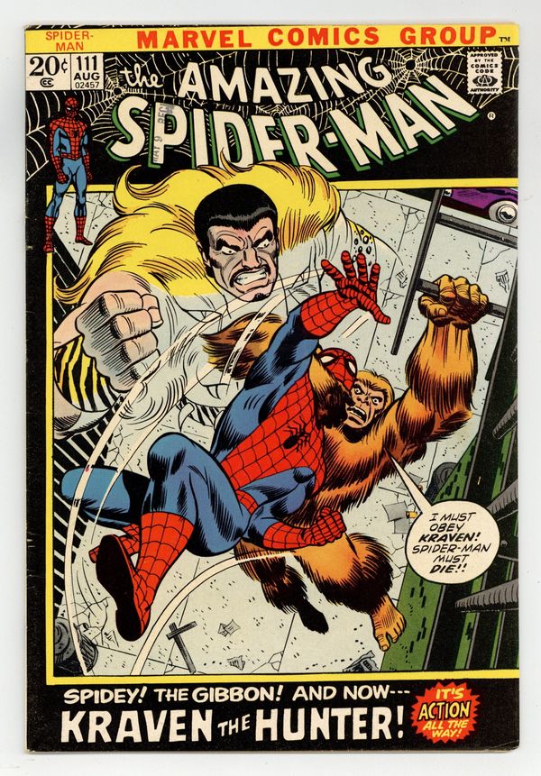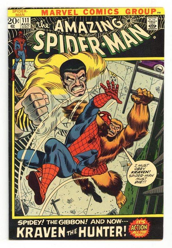 Tags: Marvel Legacy Numbering: Amazing Spider-Man (part 111), Spider-Man$29.50"To Stalk a Spider!" Part 2 of 2. Script by Gerry Conway. Pencils by John Romita. Inks by John Romita and Tony Mortellaro (backgrounds). Cover by John Romita and Frank Giacoia. Sometimes a comment made in passing can have dire consequences. When Spider-Man brushed off the Gibbon's plan to become a superhero, he didn't know -- that the novice Gibbon would fall into the hands of Kraven the Hunter! And after imbibing on Kraven's jungle potions, the Gibbon is ready to kill the web-slinger! Rest assured...the wall-crawler will take the Gibbon very serious during their next encounter! In the meantime, Aunt May has seemingly disappeared from New York City after having a tiff with Gwen Stacy. Where did she go? Cameo appearances by Joe Robertson, J. Jonah Jameson, and Gwen Stacy. (Notes: John Romita is credited as a co-plotter of the story. This issue begins Gerry Conway's 3-year run as the writer of the Amazing Spider-Man title. This story was reprinted in Marvel Tales #90.) 36 pages. Cover price $0.20.
