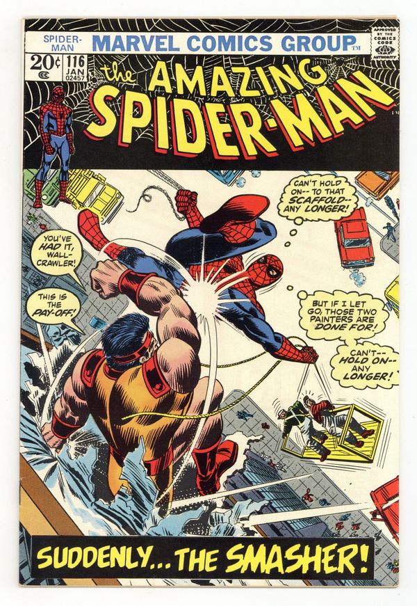 "Suddenly...the Smasher!" Part 1 of 3. Script by Stan Lee (original) and Gerry Conway (updates). Pencils by John Romita. Inks by Jim Mooney and Tony Mortellaro (backgrounds). Cover by John Romita. The gang war is over, and the Spectacular Spider-Man wants to get back to his normal life. But while web-swinging to the Daily Bugle, he's ambushed in mid-air by the Smasher! Who? The web-spinner doesn't recognize his large opponent, but he battles him to a standstill and saves the lives of two high-rise painters. In the meantime, a new candidate -- named Richard Raleigh -- is running for mayor. And he's holding a big indoor rally that Peter, Gwen Stacy, and Mary Jane attend! However, when the ceiling plaster starts falling, the wall-crawler leaps into action to keep the rally-goers safe! Is someone trying to ruin Raleigh's campaign? Cameo appearances by J. Jonah Jameson, Joe Robertson, Betty Brant, and Harry Osborn. (Notes: ASM issues 116-118 are a revised, re-edited, and colorized version of Spectacular Spider-Man Magazine #1 -- published in black and white in 1968. The script and art contain many updates (including new pages) in order to fit into Spider-Man's current continuity. ASM 116 was reprinted in Marvel Tales #95.) 36 pages. Cover price $0.20.