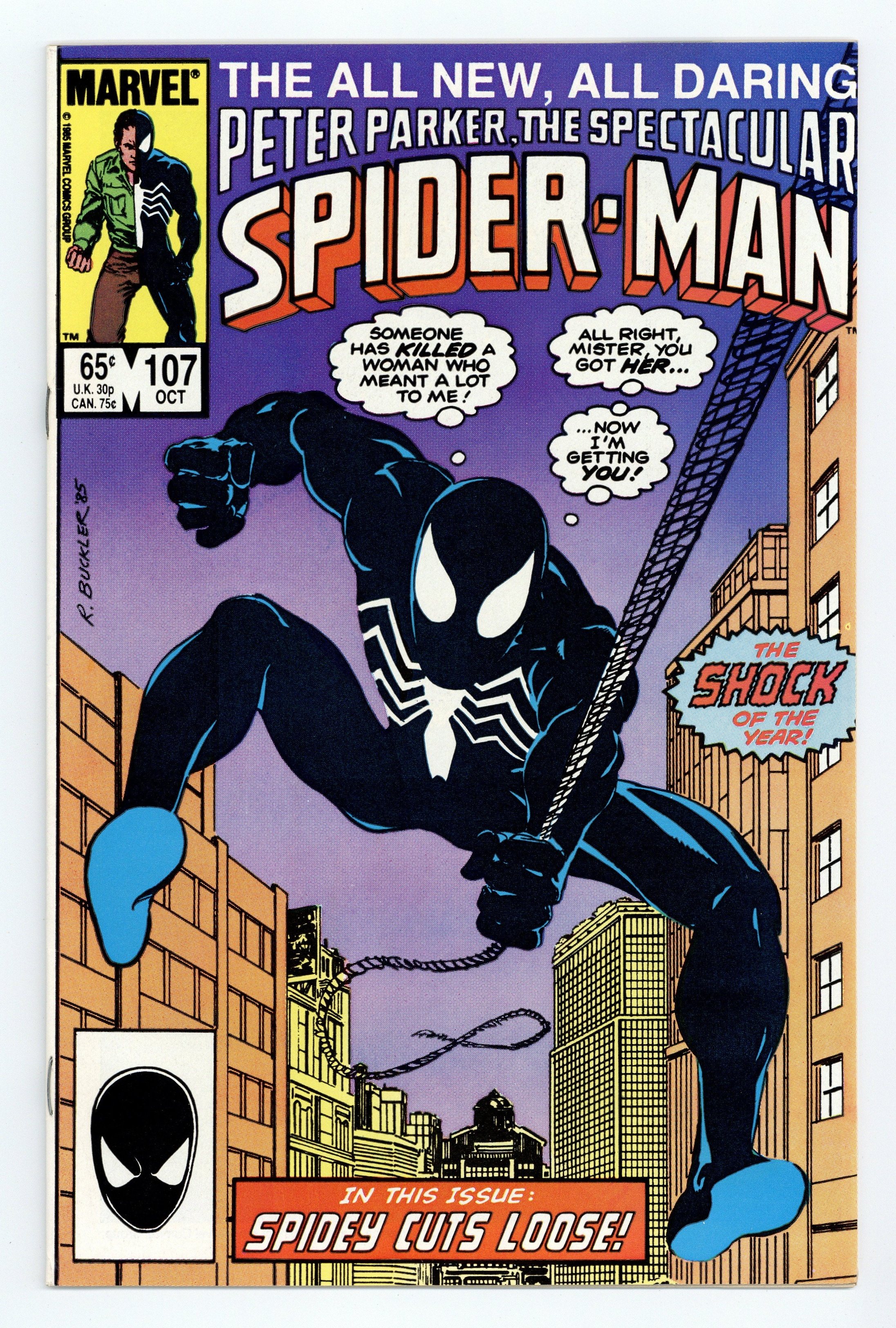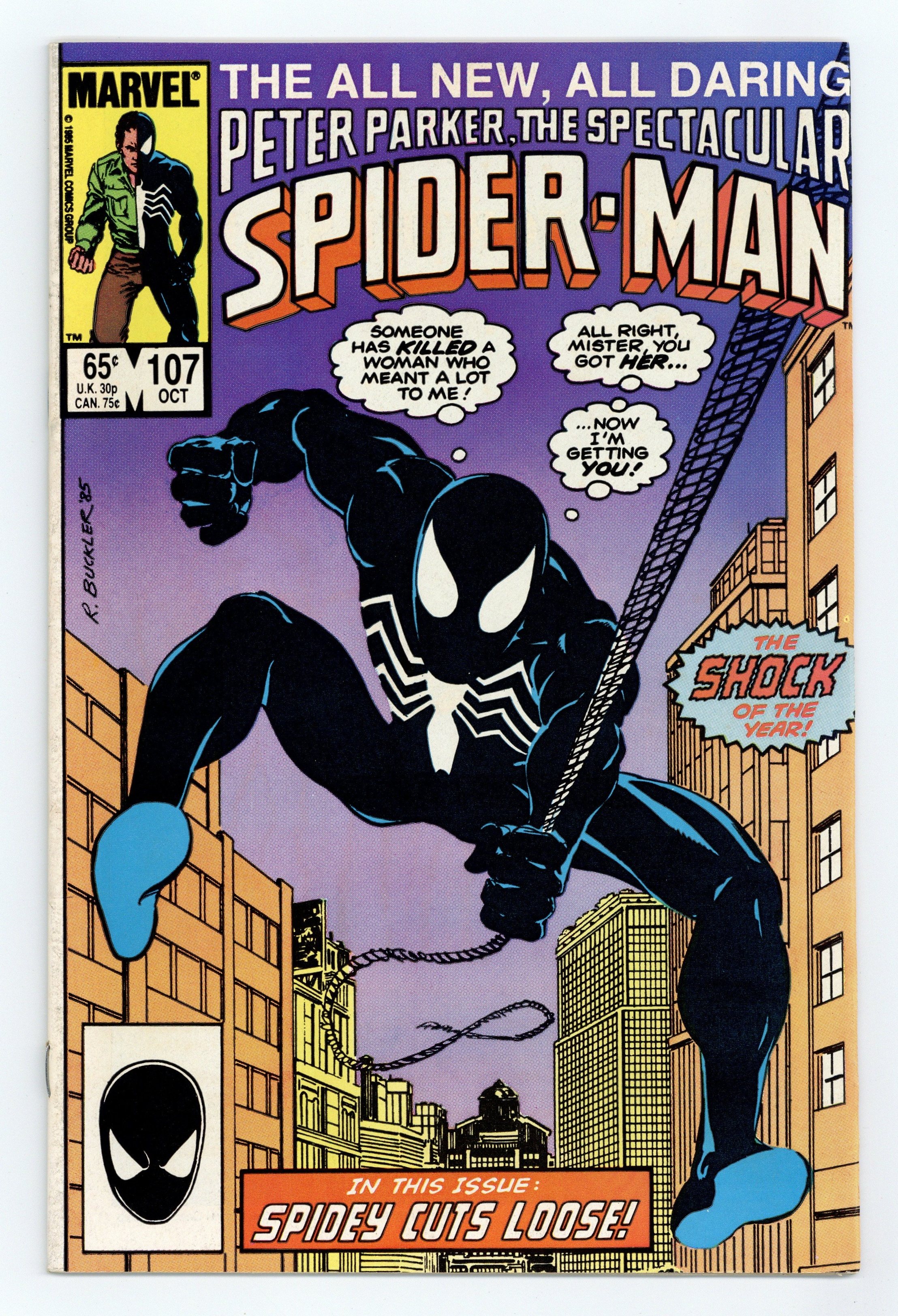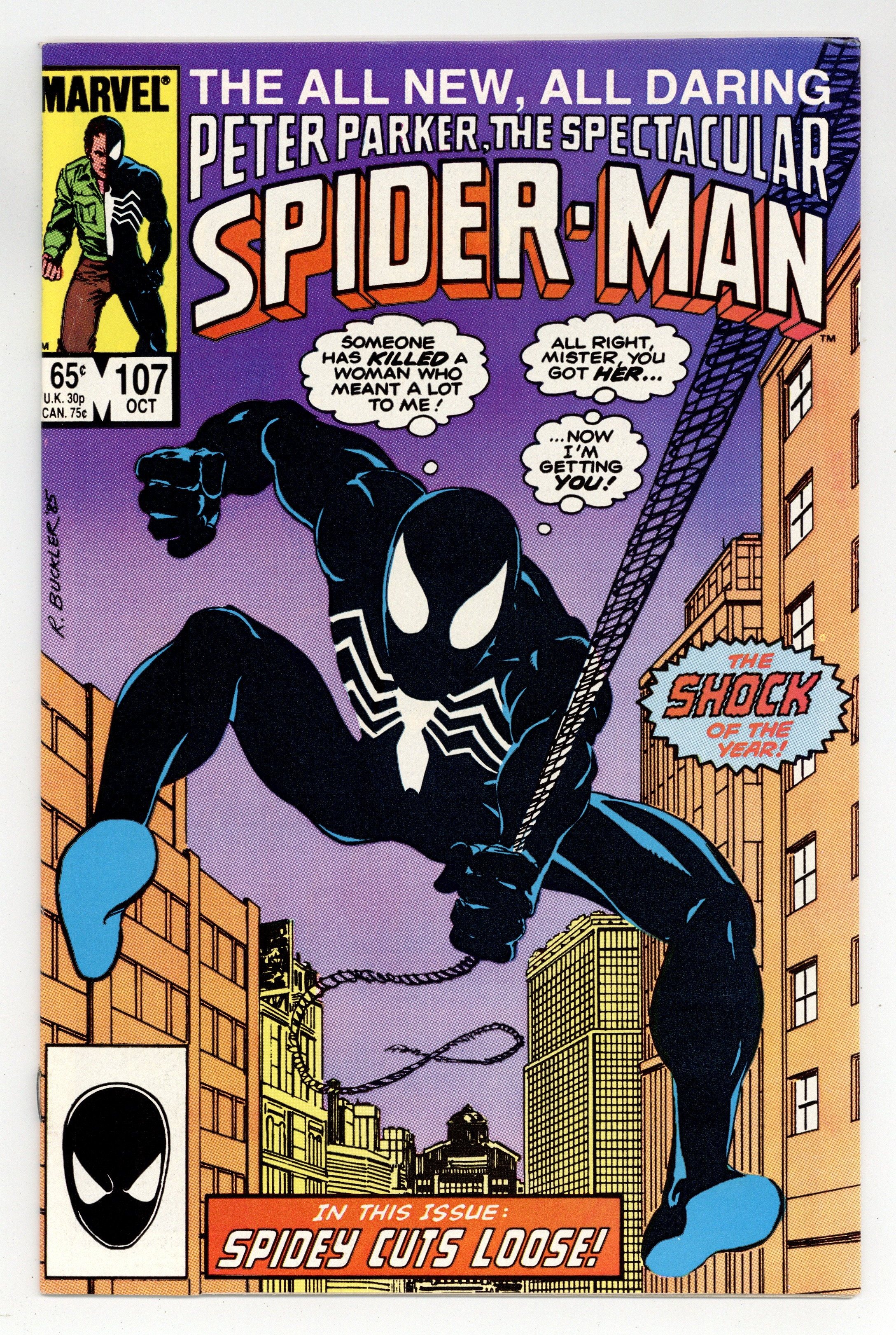 Tags: Marvel Legacy Numbering: Spectacular Spider-Man (part 107), Spider-Man$16.50Direct Edition. "Original Sin" Part 1 of 4. Guest-starring Daredevil. Script by Peter David. Pencils by Rich Buckler. Inks by Brett Breeding. Cover by Rich Buckler. The critically acclaimed Death of Jean DeWolff storyline begins with this issue. In a stunning development, police captain Jean DeWolff is found murdered in her apartment. The entire city is in a state of shock over the killing including the police department, the staff at the Daily Bugle, and the Amazing Spider-Man. The web-slinger (in his black costume) begins investigating the homicide by meeting with the detective assigned to the case, Stan Carter. However, another superhero, Daredevil, gets the first shot at stopping the murderous rampage of the Sin-Eater! First appearance of the Sin-Eater. 32 pages Cover price $0.65.