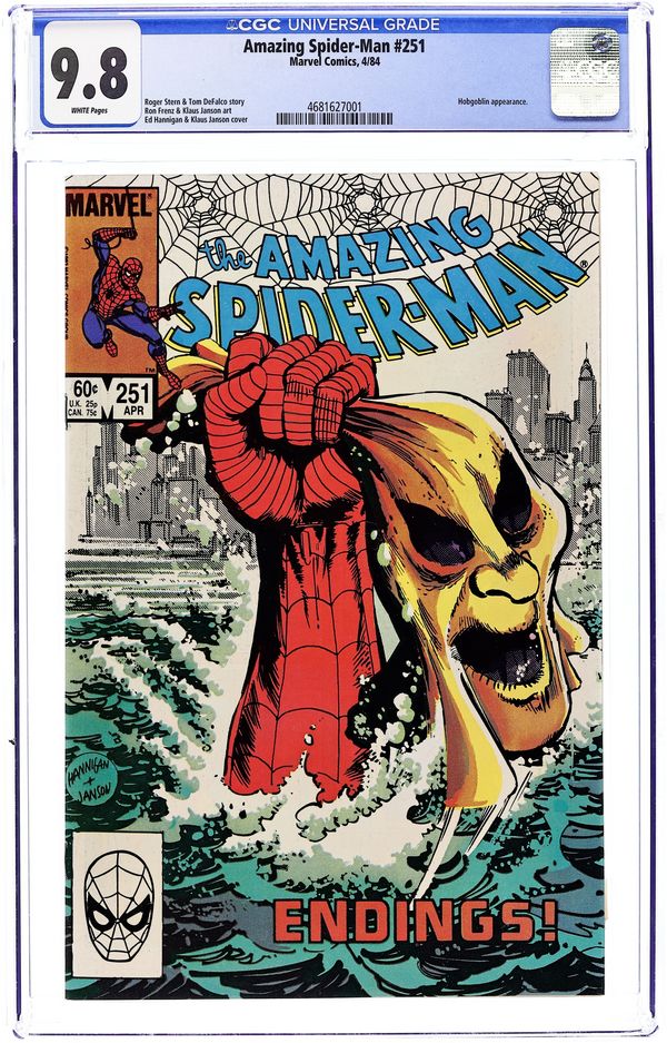 Direct Edition. "Endings!" Part 3 of 3. Plot by Roger Stern. Script by Tom DeFalco. Art by Ron Frenz (breakdowns) and Klaus Janson (finishes). Cover by Ed Hannigan and Klaus Janson. After a pumpkin bomb sets his hideout ablaze, the furious Hobgoblin drives away in his battle van! But unbeknownst to the goblin, the web-slinger is holding on for dear life underneath! When Spider-Man crawls inside...the ferocious fight begins! As the Hobgoblin and the wall-crawler trade blows, the battle van careens into the Hudson River! Is the Hobgoblin going to sleep with the fishes? Only time will tell. Several hours later Spider-Man is drawn towards a mammoth citadel in Central Park...and then suddenly disappears! Cameo appearances by Harry Osborn, J. Jonah Jameson and Joe Robertson. (Notes: The Hobgoblin returns briefly in Amazing Spiderman 255. Tom DeFalco begins his 3-year run as the writer of the Amazing Spider-Man title. Likewise, Ron Frenz begins his 3-year run as the primary penciler. This issue includes a full-page ad for the first Marvel Super Heroes Secret Wars Limited Series (where the web-slinger appears next). This three-part story was reprinted in Marvel Tales 259, 260, and 261.)36 pgs. Cover price $0.60.