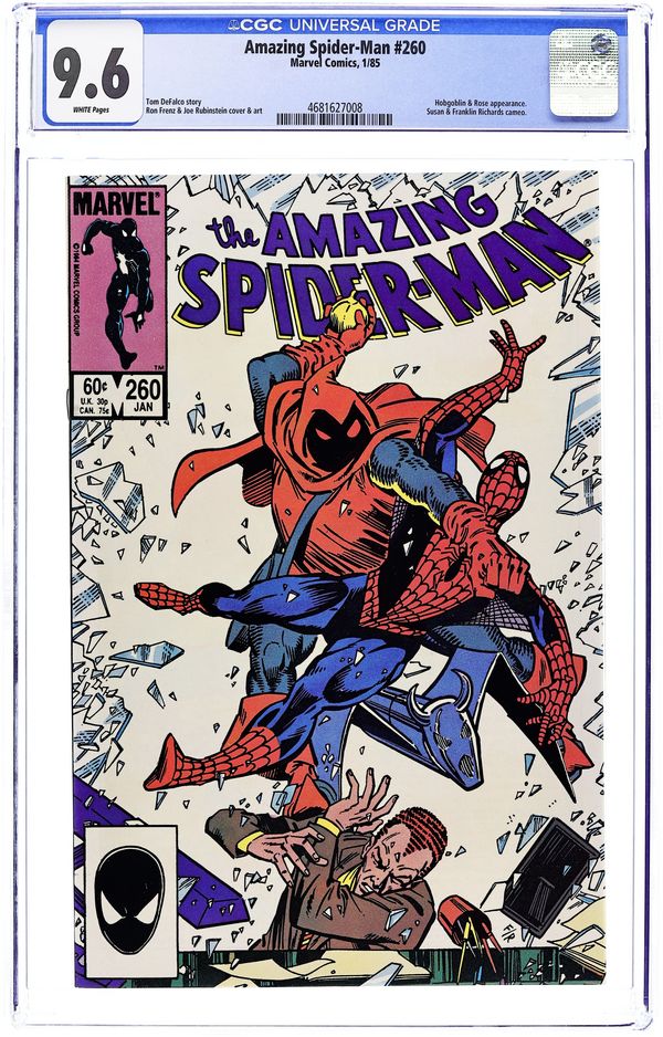 Tags: Marvel Legacy Numbering: Amazing Spider-Man (part 260), Spider-Man$15.00Direct Edition. "The Challenge of Hobgoblin!" Script by Tom DeFalco. Pencils by Ron Frenz. Inks by Joe Rubinstein and Brett Breeding. Cover by Ron Frenz and Joe Rubinstein. The Hobgoblin and the Rose unleash their two-pronged attack on Harry Osborn! The goblin ambushes Harry at his corporate office, while the Rose's henchmen kidnap Liz Osborn and Mary Jane! Auspiciously, the wondrous wall-crawler is close by to lock horns with the Hobgoblin! But who is going to save MJ and Harry's expectant wife? Could it be the Green Goblin?! Stay tuned! Cameo appearances by Aunt May, Betty Brant Leeds, Joe Robertson, J. Jonah Jameson, Susan Richards, Franklin Richards, and the alien symbiote (costume). (Note: This story was reprinted in Marvel Tales 274.) 36 pgs. Cover price $0.60.