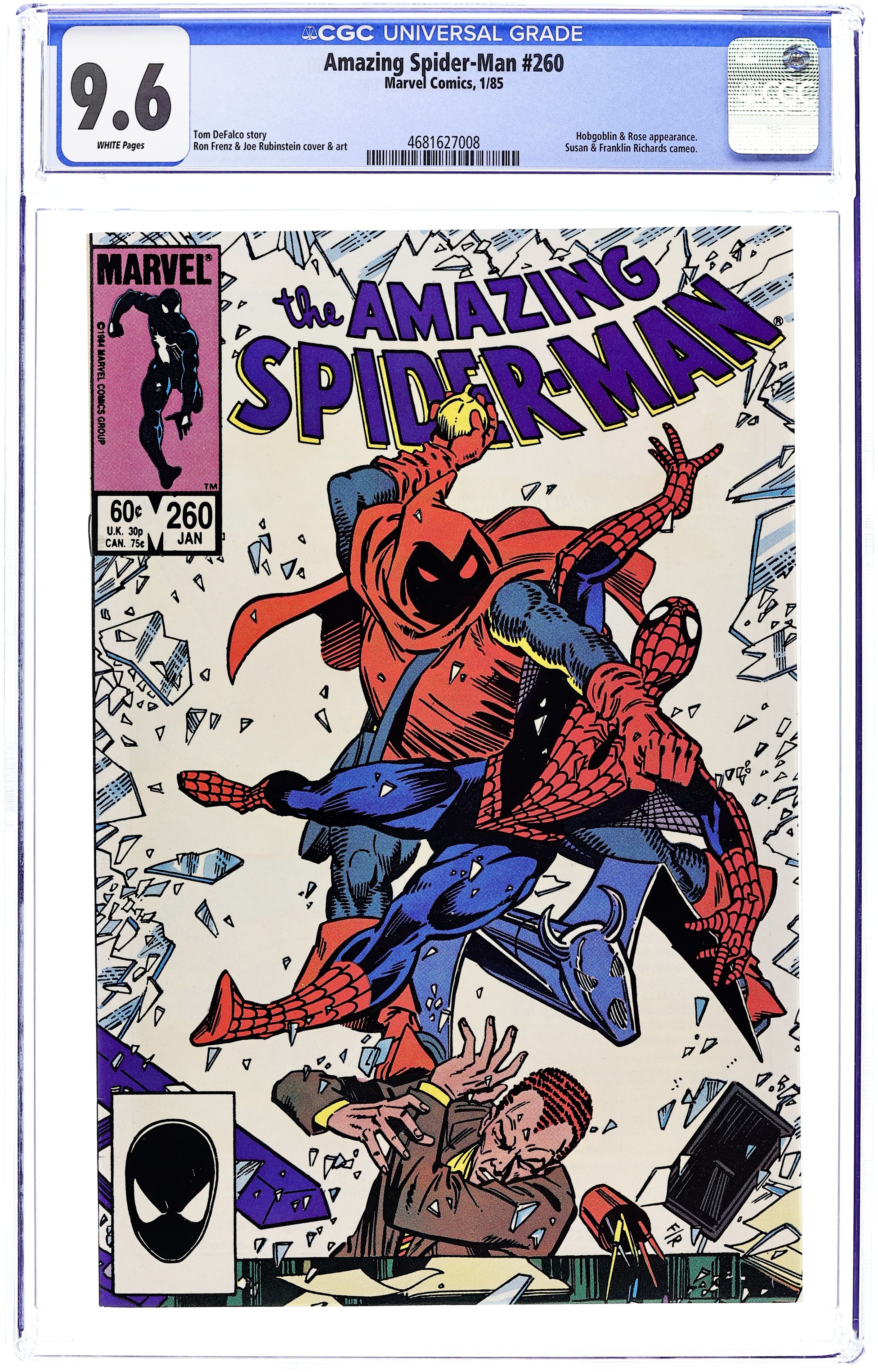 Tags: Marvel Legacy Numbering: Amazing Spider-Man (part 260), Spider-Man$13.00Direct Edition. "The Challenge of Hobgoblin!" Script by Tom DeFalco. Pencils by Ron Frenz. Inks by Joe Rubinstein and Brett Breeding. Cover by Ron Frenz and Joe Rubinstein. The Hobgoblin and the Rose unleash their two-pronged attack on Harry Osborn! The goblin ambushes Harry at his corporate office, while the Rose's henchmen kidnap Liz Osborn and Mary Jane! Auspiciously, the wondrous wall-crawler is close by to lock horns with the Hobgoblin! But who is going to save MJ and Harry's expectant wife? Could it be the Green Goblin?! Stay tuned! Cameo appearances by Aunt May, Betty Brant Leeds, Joe Robertson, J. Jonah Jameson, Susan Richards, Franklin Richards, and the alien symbiote (costume). (Note: This story was reprinted in Marvel Tales 274.) 36 pgs. Cover price $0.60.