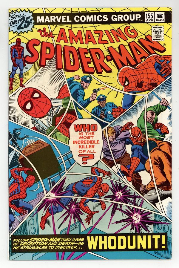 Tags: Marvel Legacy Numbering: Amazing Spider-Man (part 155), Spider-Man$18.00"Whodunit!" Script by Len Wein. Art by Sal Buscema (layouts) and Mike Esposito (finishes). Cover by John Romita. In shocking fashion the co-developer of the Worldwide Habitual Offender database is found murdered in his research lab! And the task of finding the killer falls to none other than your friendly neighborhood Spider-Man! The web-slinger scours the city searching for suspects! But the trail of clues leads back to the lab! Who is the killer? Who indeed! Cameo appearances by Joe Robertson and J. Jonah Jameson. (Notes: The letters page includes a statement of ownership: average print run 530,714; average paid circulation 273,773. This story was reprinted in Marvel Tales 132. A 30-cent cover price variant exists for this issue.) 36 pages. Cover price $0.25.