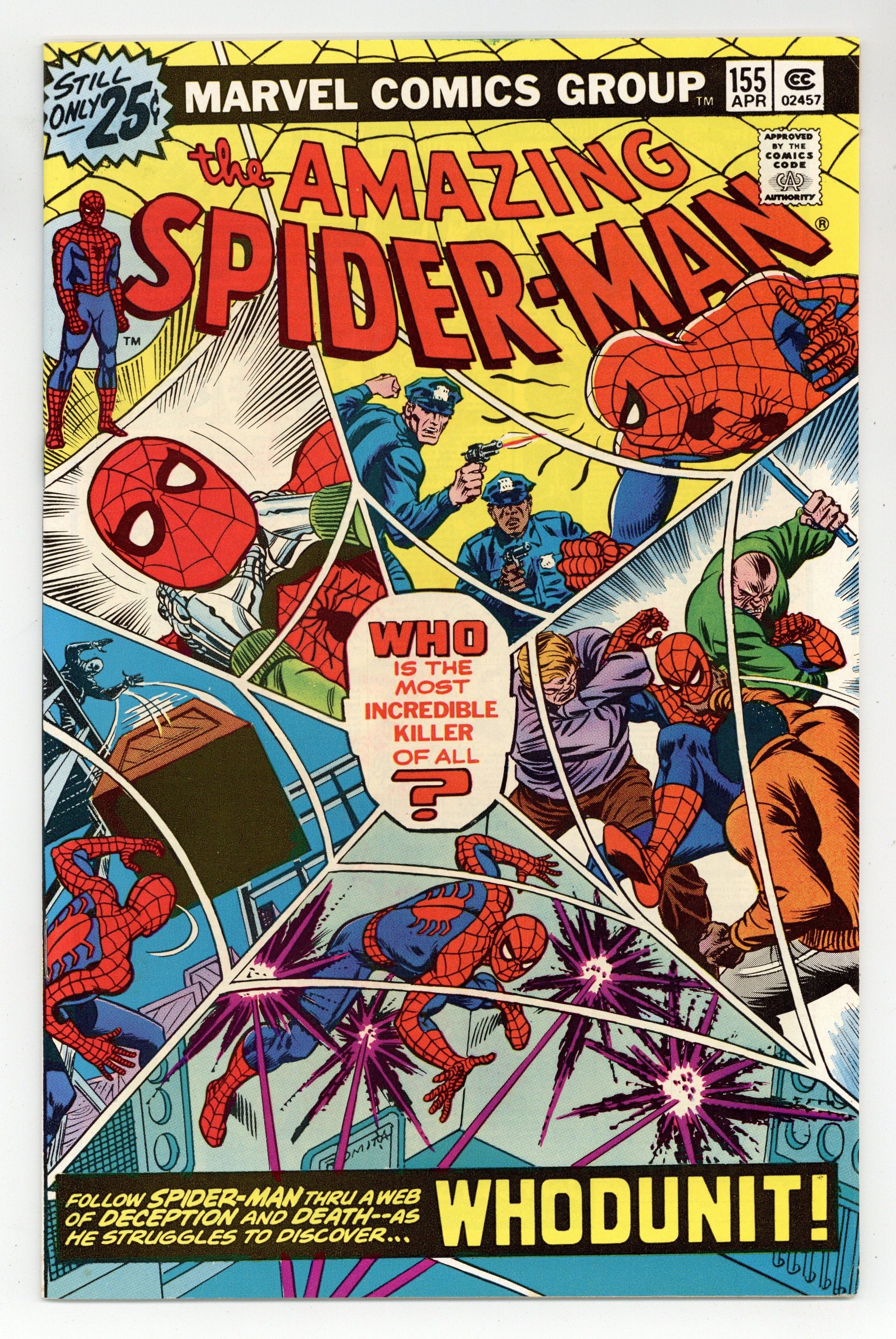 "Whodunit!" Script by Len Wein. Art by Sal Buscema (layouts) and Mike Esposito (finishes). Cover by John Romita. In shocking fashion the co-developer of the Worldwide Habitual Offender database is found murdered in his research lab! And the task of finding the killer falls to none other than your friendly neighborhood Spider-Man! The web-slinger scours the city searching for suspects! But the trail of clues leads back to the lab! Who is the killer? Who indeed! Cameo appearances by Joe Robertson and J. Jonah Jameson. (Notes: The letters page includes a statement of ownership: average print run 530,714; average paid circulation 273,773. This story was reprinted in Marvel Tales 132. A 30-cent cover price variant exists for this issue.) 36 pages. Cover price $0.25.