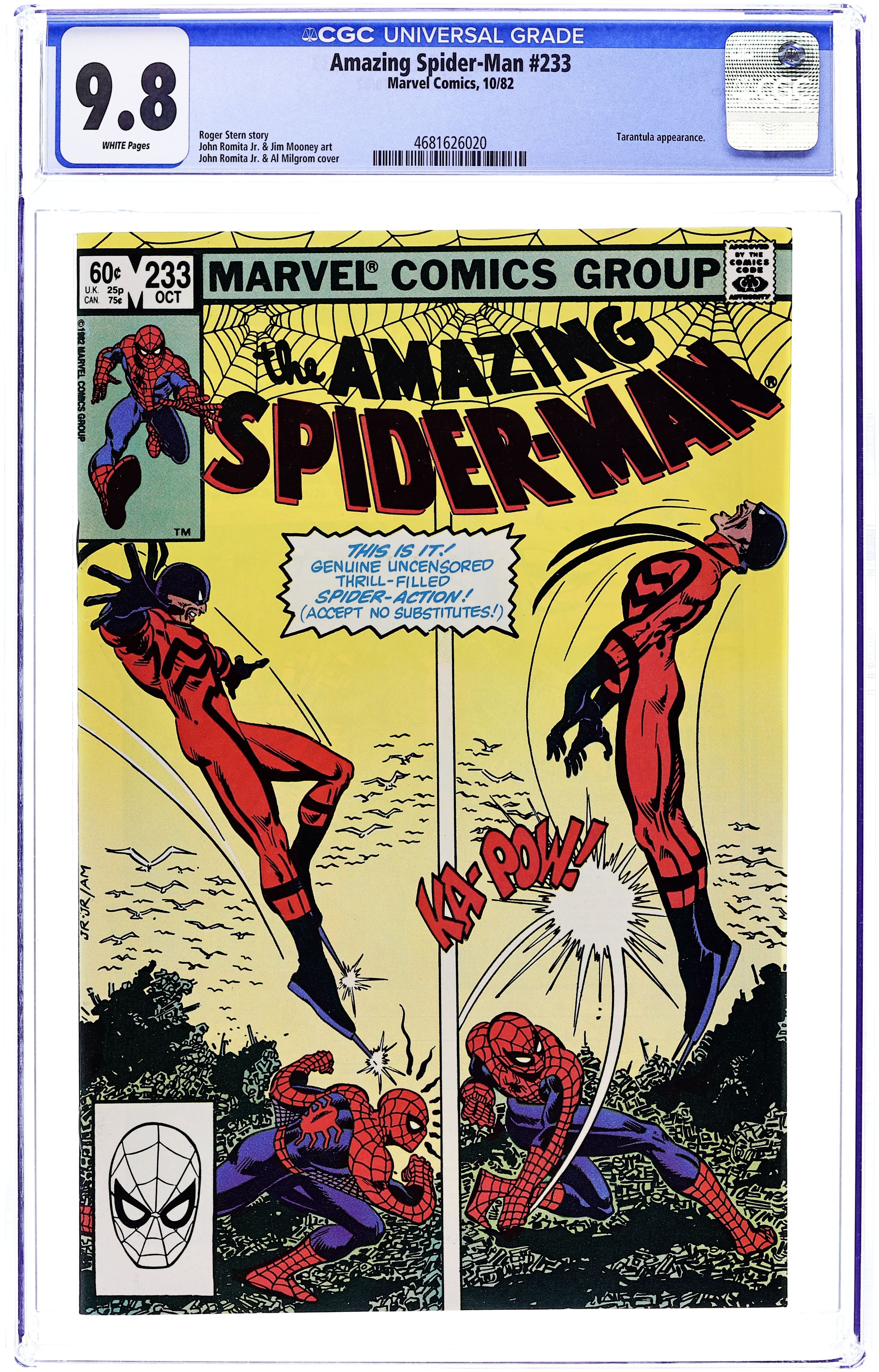Direct Edition. "Where the @¢%# is Nose Norton?" Part 1 of 4. Script by Roger Stern. Art by John Romita Jr. (breakdowns) and Jim Mooney (finishes). Cover by John Romita Jr. and Al Milgrom. J. Jonah Jameson puts out an A.P.B. on Nose Norton! The underworld informant that was supposed to give the Daily Bugle key info for its exposé on the Brand Corporation! But Jolly Jonah isn't the only one that wants the Nose! So do Peter Parker, Ben Urich, and the Tarantula! On the Staten Island waterfront, all concerned parties come together! And Spider-Man and the Tarantula tangle again...for the Nose! Cameo appearances by Joe Robertson and Ned Leeds. (Notes: The Tarantula previously appeared in Spectacular Spider-Man 3. This story was reprinted in Spider-Man Magazine 5.) 36 pgs. Cover price $0.60.