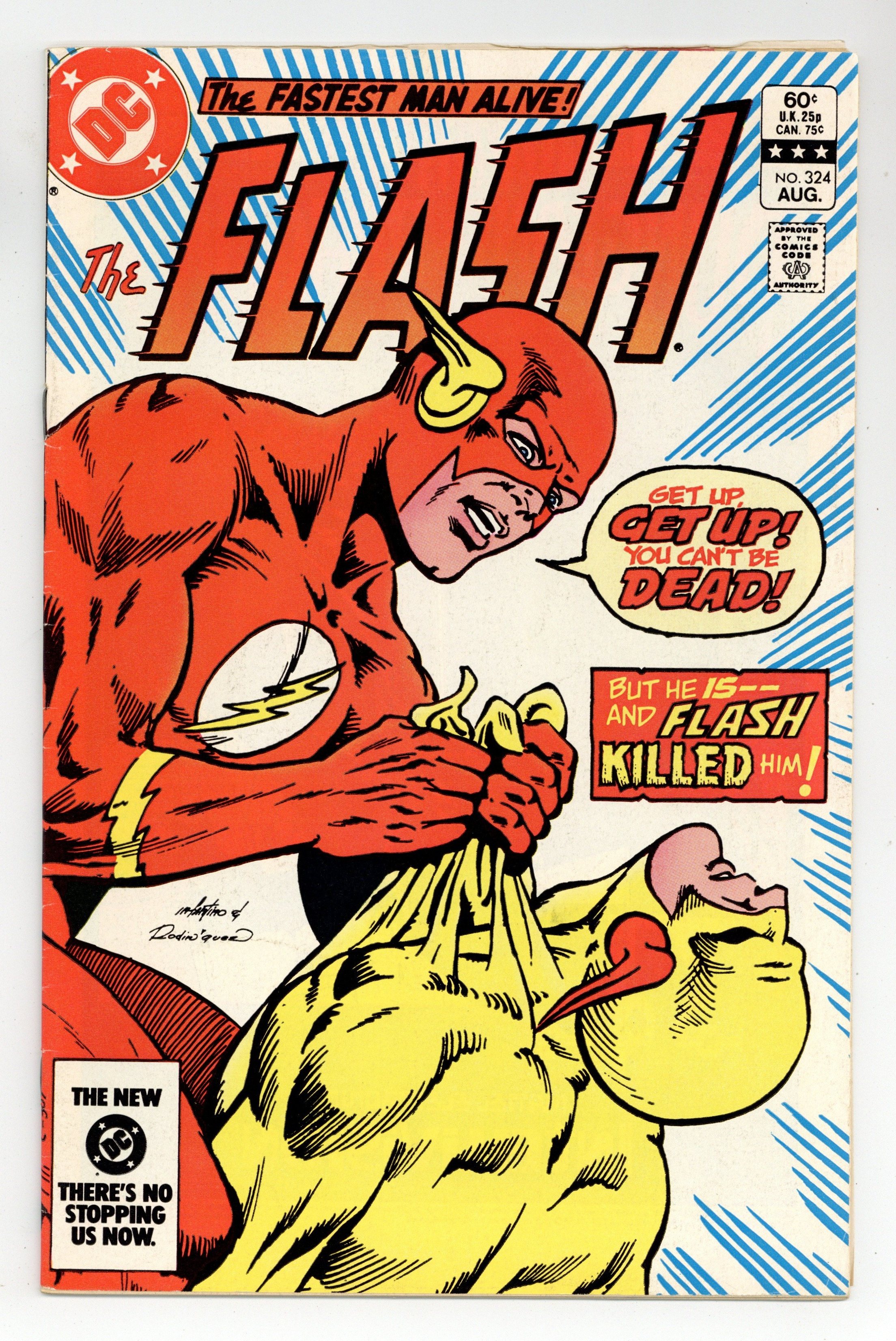 Direct Edition. Cover pencils by Carmine Infantino, inks by Rodin Rodriguez. The Slayer and the Slain, script by Cary Bates, pencils by Carmine Infantino, inks by Dennis Jensen; While Fiona Webb waits at the altar, Flash engages in an epic battle with Reverse-Flash and ends up killing him to save Barry's bride to be; Kid Flash makes a guest appearance; This leads to the dominant story-line of the last 26 issues, the trial of Flash for the murder of Prof Zoom. Advanced Dungeons & Dragons Intellivision ad. Warlord toy ad from Remco. Batman and the Outsiders ad, art by Jim Aparo. Meanwhile… column by Dick Giordano. Universal Monsters model kits ad from Monogram. Tron Atari 2600 ad. 36 Pages, Full Color. Cover price $0.60.