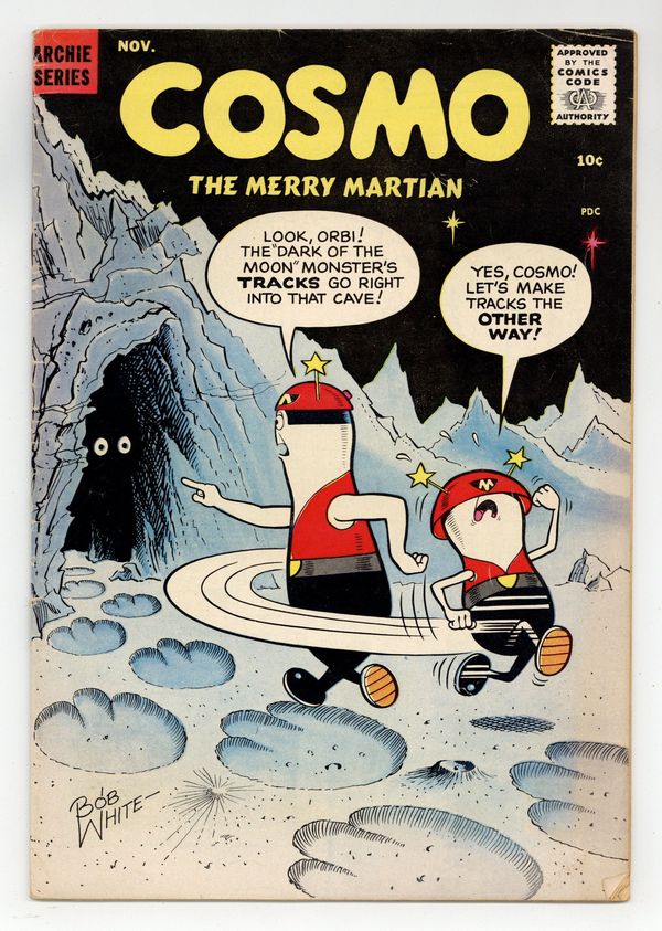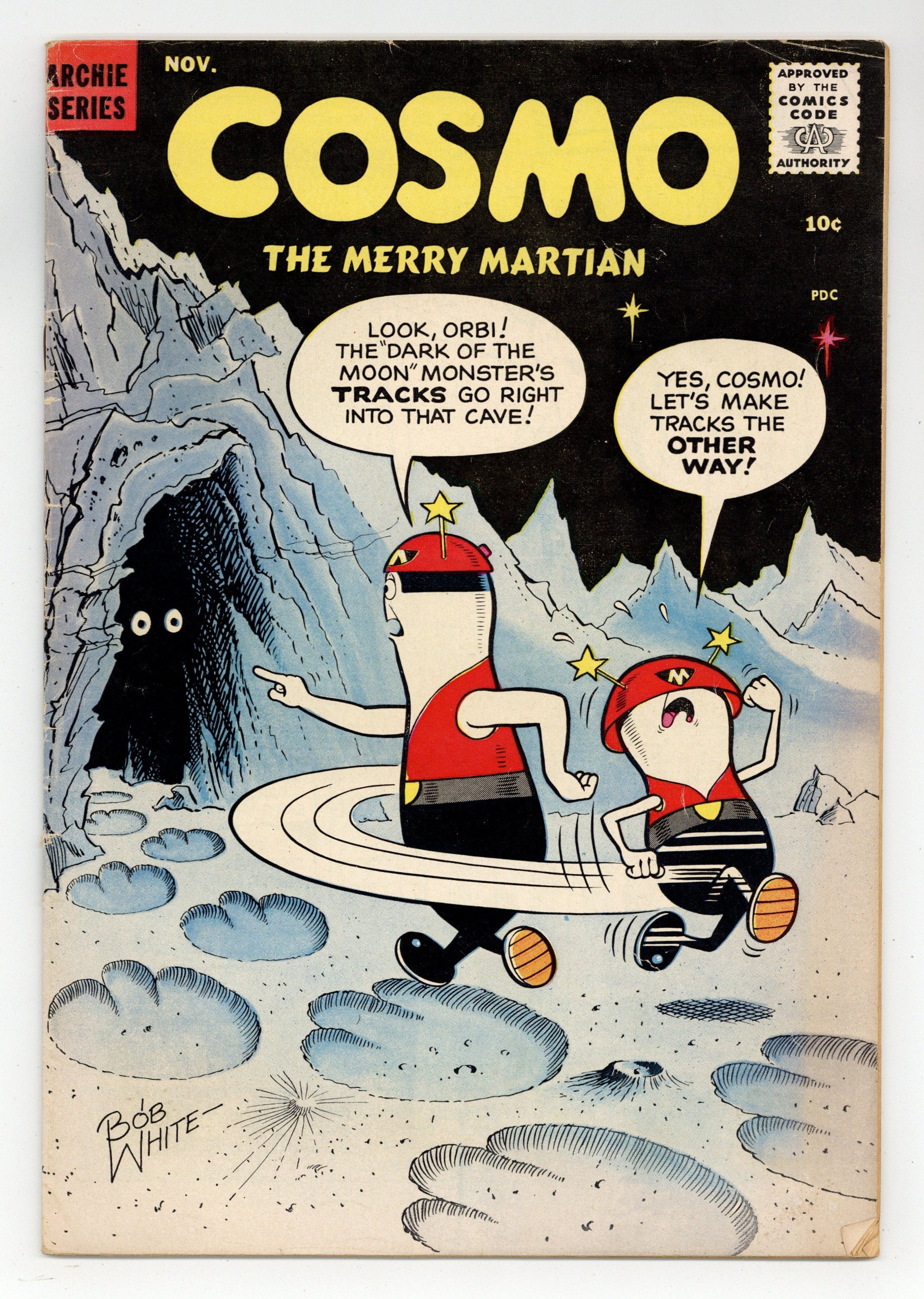 Published Feb 1959 by Archie Publications.$24.00Cover art by Bob White. The Great Gillywump Hunt!, script by Sy Reit, art by Bob White; On the moon, Cosmo and Orbi are told by the Moonlings that the Dark Side of the Moon is inhabited by a terrifying unseen creature called the Gillywump, who emits spooky noises. Moon Rocket text article; The Martians go to investigate and find that the Gillywump is a harmless creature who makes "GRONK!" noises because he has a terrible cold. 36 pgs. $0.10. Cover price $0.10.