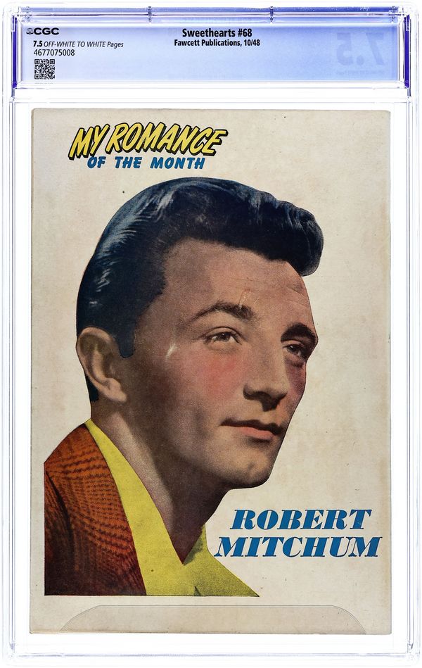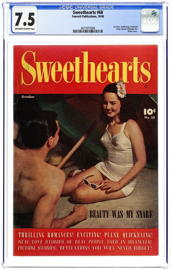 Numbering continues from Captain Midnight (1942-1948 Fawcett) #67. Sweethearts was the first monthly romance title, and the fourth series overall, during the Golden Age's boom in romance comics. Patty is unreasonably jealous of all the beautiful models that photographer Bill gets to work with. Jean meets handsome Bob at the electrical plant where her father works, but she doesn't want to date a factory worker. Scheming Connie uses her beauty to work her way up the ladder at her office, but loses the love of Howard in the process. Plus a comics biography of actor Robert Mitchum, a romance-themed horoscope, and a comics version of a classic Romantic poem by Ben Jonson, To Celia. Great Love Poems: To Celia; My Jealous Sin; I Was a Snob; My Romance of the Month: Robert Mitchum; False Love; Reckless; Beauty Was My Snare; Star Mates: Libra. 48 pages, Full Color. Cover price $0.10.