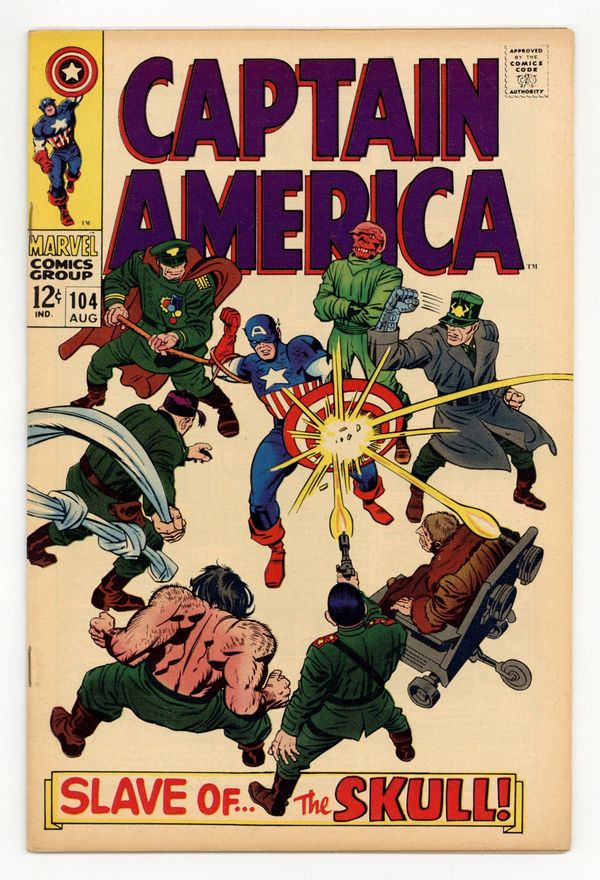 Tags: Marvel Legacy Numbering: Captain America (part 104), Captain America$21.50Cover pencils by Jack Kirby, inks by Dan Adkins. "Slave of the Skull!", script by Stan Lee, pencils by Jack Kirby, inks by Dan Adkins and Jim Steranko (p. 11); Shield asks Captain America to test their Life Model Decoys; After Cap easily defeats them, Nick Fury sends them back to the lab; Cap goes to Shields doctor for help with headaches; Red Skull tells Shield he has placed nuclear tape on the back of Captain America's neck; He warns that anyone who tries to remove the special tape would activate the timer on a bomb planted in Washington D.C. by one of the Skull's spies. 36 pgs., full color. $0.12. Cover price $0.12.
