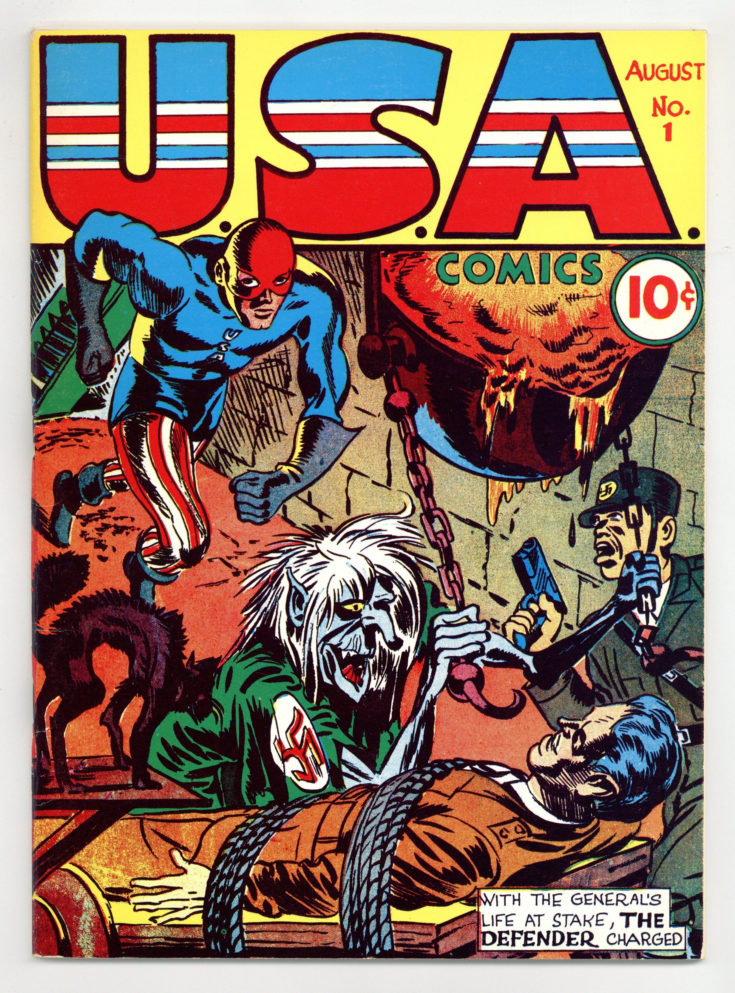 The third issue of the Flashback reprint series presents U.S.A. Comics # 1 originally published in August 1941 by Timely (now Marvel). The Defender illustration, script by Joe Simon and Jack Kirby, art by Joe Simon. "The Hideous Dame Kackle," inks by Charles Nicholas; When U.S. Marine Don Stevens investigates the death of a man who was pushed from an old schooner, it is the Defender who is called to the fore to battle the evil Dame Kackle. "The Origin of The Whizzer," pencils by Al Avison, inks by Al Gabriele; Crook Granno "makes" Dr. Frank kill a patient he is operating on and tells the good doctor to get out of the country---or else!; But Frank's son, now known as the Whizzer, sees things differently and vows revenge on the man who led Dr. Frank to die in the jungles of Africa. "The Spirits of Freedom," script by Phil Sturm, pencils by Syd Shores, inks by George Klein; Hitler threatens America through the use of fifth columnists to destroy America's arsenals and powerhouses. But the U.S. has an ace in the hole: Mr. Liberty. "The Tunnel that Led to Death," script and art by Basil Wolverton; Gollings, construction engineer, agrees to build a tunnel from Roffler's basement for the sum of $5000, not realizing over the top of it will be built a giant airfield, whose airplanes will be used to destroy a factory. Captain America Wants You ad. "The Coming of the Young Avenger," art by Howard Purcell (as Michael Robard); Young Avenger (Bill Byron) vs. Eric von Himmel. "The Origin of Jack Frost," script by Stan Lee, art by Charles Nicholas; With his dying breathe, a man tells Jack Frost to save his daughter from a man out to steal the gold mine in Alaska that he had discovered. 64-pages, full color cardstock covers, 7-3/4-in. x 10-3/8-in., black-and-white interior on white paper stock, saddle-stitched binding. Cover price $3.00.