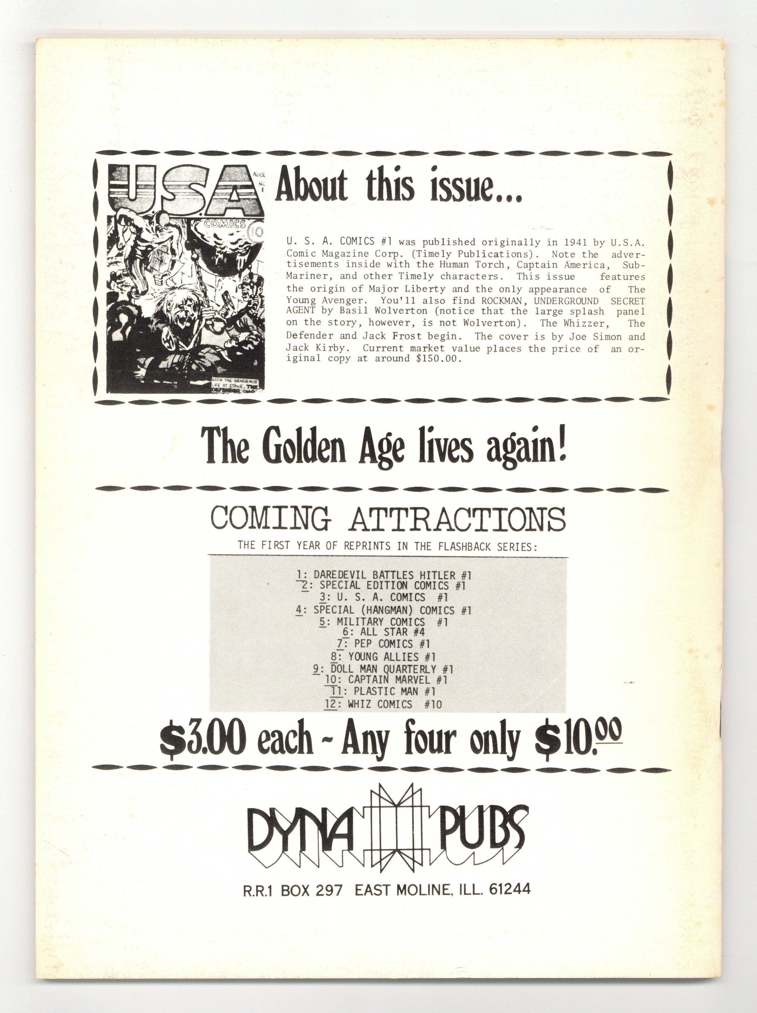 Tags: DynaPubs Flashback Series, Flashback Reprint Series (part 3)$34.00The third issue of the Flashback reprint series presents U.S.A. Comics # 1 originally published in August 1941 by Timely (now Marvel). The Defender illustration, script by Joe Simon and Jack Kirby, art by Joe Simon. "The Hideous Dame Kackle," inks by Charles Nicholas; When U.S. Marine Don Stevens investigates the death of a man who was pushed from an old schooner, it is the Defender who is called to the fore to battle the evil Dame Kackle. "The Origin of The Whizzer," pencils by Al Avison, inks by Al Gabriele; Crook Granno "makes" Dr. Frank kill a patient he is operating on and tells the good doctor to get out of the country---or else!; But Frank's son, now known as the Whizzer, sees things differently and vows revenge on the man who led Dr. Frank to die in the jungles of Africa. "The Spirits of Freedom," script by Phil Sturm, pencils by Syd Shores, inks by George Klein; Hitler threatens America through the use of fifth columnists to destroy America's arsenals and powerhouses. But the U.S. has an ace in the hole: Mr. Liberty. "The Tunnel that Led to Death," script and art by Basil Wolverton; Gollings, construction engineer, agrees to build a tunnel from Roffler's basement for the sum of $5000, not realizing over the top of it will be built a giant airfield, whose airplanes will be used to destroy a factory. Captain America Wants You ad. "The Coming of the Young Avenger," art by Howard Purcell (as Michael Robard); Young Avenger (Bill Byron) vs. Eric von Himmel. "The Origin of Jack Frost," script by Stan Lee, art by Charles Nicholas; With his dying breathe, a man tells Jack Frost to save his daughter from a man out to steal the gold mine in Alaska that he had discovered. 64-pages, full color cardstock covers, 7-3/4-in. x 10-3/8-in., black-and-white interior on white paper stock, saddle-stitched binding. Cover price $3.00.