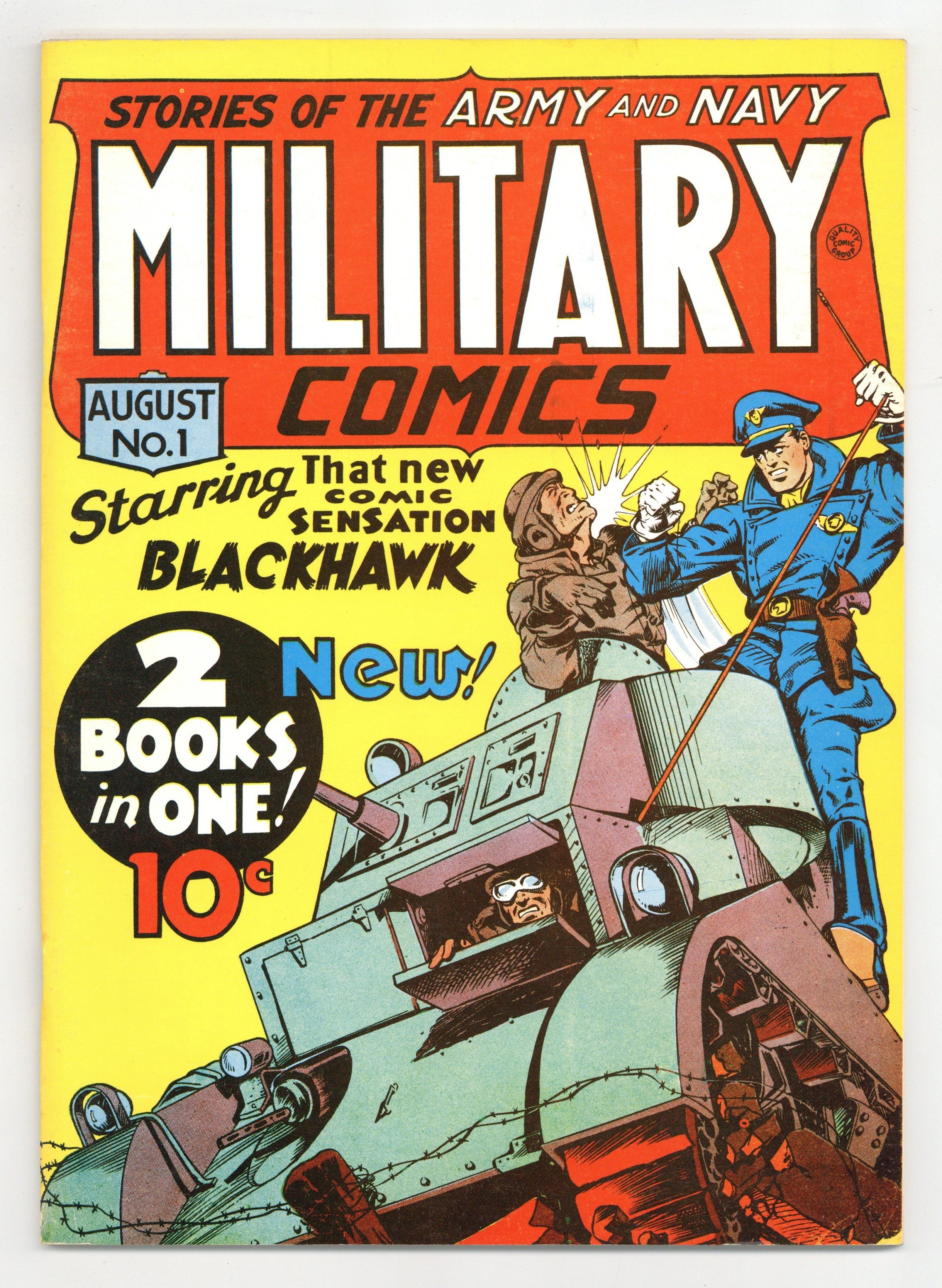 The fifth issue of the Flashback reprint series presents Military Comics # 1 originally published in 1941 by Quality Comics Group. The first appearance of Blackhawk. Cover art by Will Eisner. "The Origin of Blackhawk," script by Will Eisner and Bob Powell, art by Chuck Cuidera; Warsaw, Poland 1939; The Nazis are massing to rout the Polish Air Force, the only obstacle to their victory over Poland, and are being led by the Nazi commander, Captain von Tepp; However, in his attack, the brother and sister of a lone survivor are killed, and this survivor, later to become The Blackhawk, vows to hunt down von Tepp and make him pay personally for their deaths. "Flying with the Red Dragon Squadron," art by Bob Powell (as Bud Ernest); The boys lose their contract as test pilots after a crack-up and find themselves being asked to join a group called the Red Dragon Squadron. "Origin of the Blue Tracer," art by Fred Guardineer; "Wild Bill" Dunn, an American engineer, survives a British scouting expedition in Ethiopia, meets an Australian named Private Jones, and for months they work together to create a war machine from the remains of Fascist equipment that they call the Blue Tracer, and which they hope will provide the capabilities to overcome a local enemy tribe. "Enlisting the Hard Way," script and art by Klaus Nordling; An unlikely duo team up to foil the attempts of a Nazi attache who is interested in obtaining information on a secret U.S. fighter. "The Coming of the Yankee Eagle," script by John Stewart, art by William Smith; A group of Nazi spies work their way into the ranks of America's military services, attempting to turn over to the enemy some of the U.S.'s best ships. "The Origin of the Death Patrol," script and art by Jack Cole. "The Origin of Miss America," art by Elmer Wexler; Miss America (Joan Dale) vs. Mr. Grost. "Sink the Kaiser Adolf," art by Henry Kiefer; The schooner "Albatross" succeeds in capturing the Battleship "Kaiser Adolf," then must take on the Nazis' new battleship, "Kronzprinz Albrecht." 68-pages, full color cardstock covers, 7-3/4-in. x 10-3/8-in. black-and-white interior on white paper stock, saddle-stitched binding. Cover price $3.00.