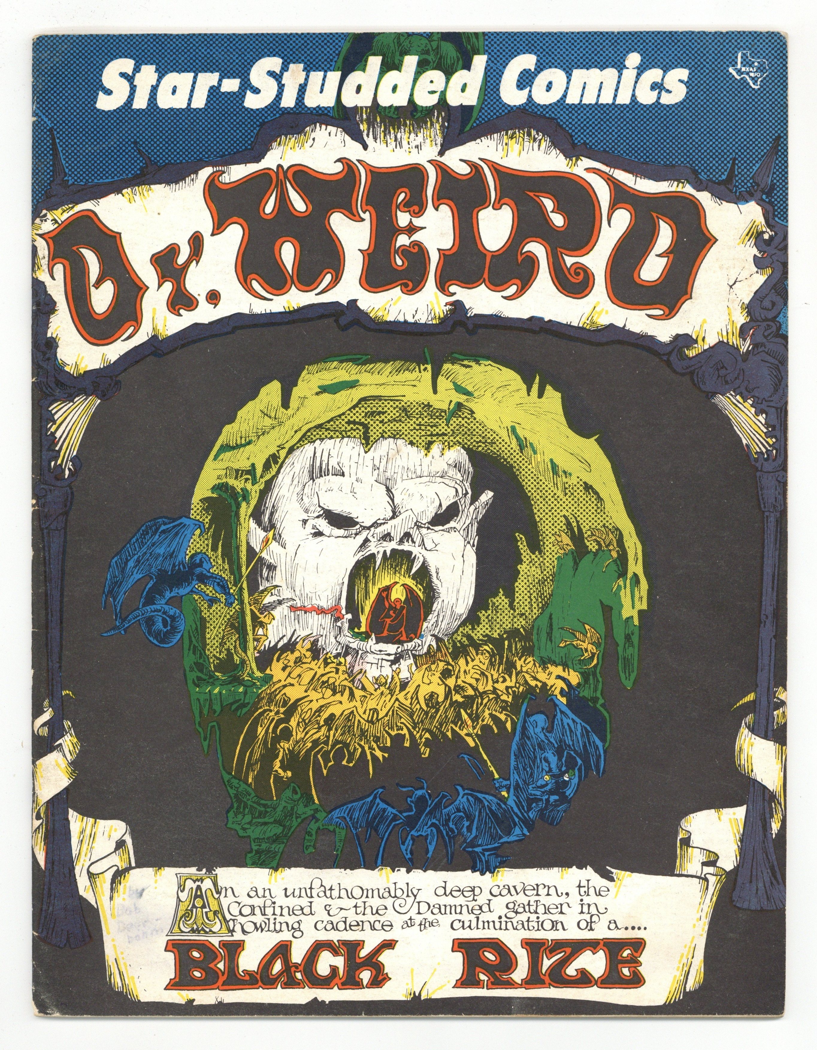 Star-Studded Comics 11 - Summer 1967 Format: Offset/Lithograph process Wrap-around binding with staples in center. Original price was 50 cents Color cover by George Metzger features Dr. Weird and back cover features Gully Foyle by Stanley Pitt. "Let's Talk It Over!" column notes that the print run of this issue was 500 copies. "From Our Readers" has letters from Harold Julian, Gordon Flagg Jr., and Mickey Schwaberow. Issue also features a column called "Bidgee" by John Ryan which tells of comic related news from Australia and features descriptions and art of a popular Australian comic strip called "Gully Foyle." Stories:Dr. Weird in "Black Rite" Comic story with script by George Metzger and Peter Grant and art by George Metzger and Rick Shubb The Changling in "Scabbard Strikes!" Comic story with script and art by Ron Harris Dr. Weird in "Dr. Weird Meets The Demon" Comic story with script and art by Buddy Saunders Cover price $0.50.