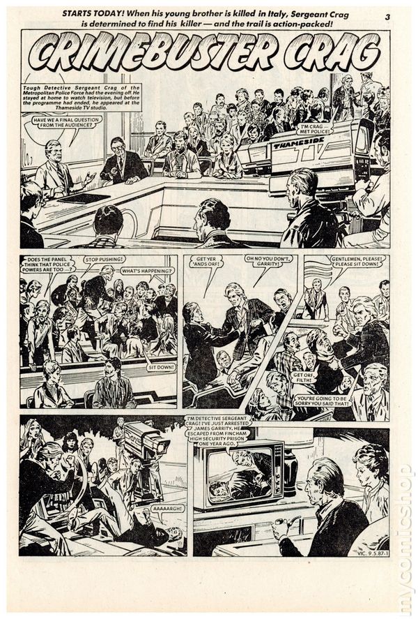 UK series. June 13th, 1987. Stories include Victor, The Hunting of Rupe Landers, The Ten Sacred Symbols of Buddha, Tough at the Top, Spitfire!, Figaro, Crimebuster Crag, Journey Into Danger, The White Samurai, Wheels of Death, and Policeman in Khaki. 8 1/4" x 11 7/8", 32 pages, B&W, 22p cover price.
