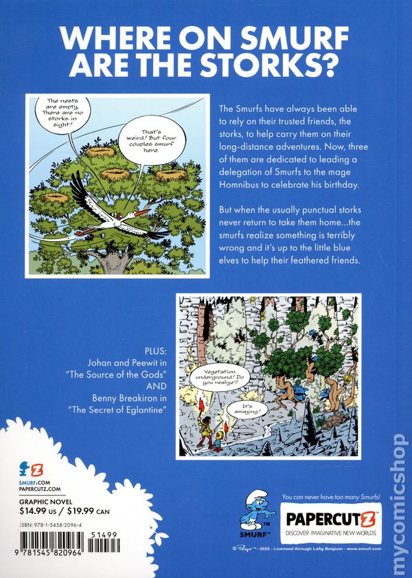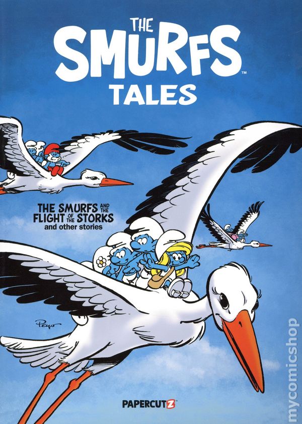 Volume 14 - 1st printing. "The Smurfs and the Flight of the Storks and Other Stories!" Written by Peyo, Thierry Culliford, Alain Jost, Luc Parthoens, and Pascal Garray. Art by Peyo, Jeroen De Coninck, Miguel Diaz, Laurent Cagniat, and Pascal Garray. Cover by Peyo. The Smurfs have always been able to rely on their trusted friends, the storks, to help carry them on their long-distance adventures. Now, three of them are dedicated to leading a delegation of Smurfs to the mage Homnibus to celebrate his birthday. But when the usually punctual storks are not there to return the Smurfs home⦠something is terribly wrong.Plus-Benny Breakiron The Secret of EglantineJohan and Peewit The Source of the Gods Softcover, 6-in. x 9-in., 160 pages, full color. All Ages Cover price $14.99.
