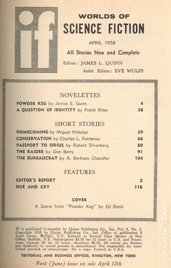February 1958. Cover by Mel Hunter. Stories: "Assassin" by J. F. Bone, "The Barbarians" by John Sentry, "The Feeling of Power" by Isaac Asimov, "The Hero" by Elaine Wilber, "Contamination Crew" by Alan E. Nourse, "Out From the Sun" by Arthur C. Clarke, "Security Risk" by Ed M. Clinton, Jr., "The Standardized Man" by Stephen Bartholomew, and "Feet of Clay" by Philip Hoskins. 5.25-in. x 7.5-in.; 120 Pages, B&W. Cover price $0.35.