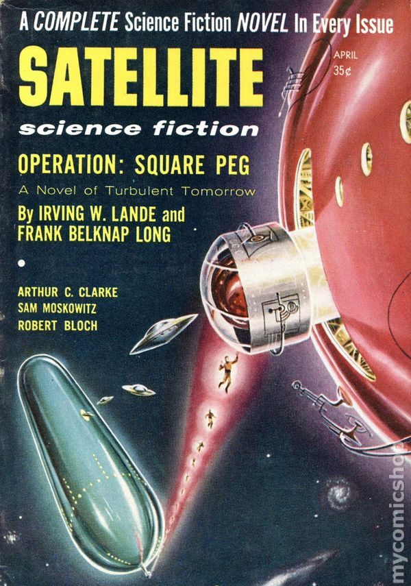 April 1957. Cover by Ed Emshwiller. Science fiction stories: "Operation: Square Peg" by Irving W. Lande and Frank Belknap Long, "Cold War" by Arthur C. Clarke, "Act of Creation" by Gordon R. Dickson, "Welcome, Stranger" by Robert Bloch, "The Wheel" by Stephen Barr, "The Three Hours You Left Me Alone" by Mann Rubin, "The Science Fiction Collector" by Sam Moskowitz. Leo Margulies, publisher. 5-3/8 in. x 7-5/8 in.; black and white; 132 pages. Cover price $0.35.