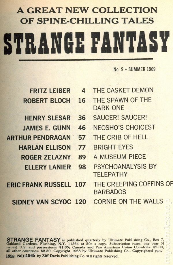 Fall 1969. Reprints Pulp Fantasy stories by Ray Bradbury, Fritz Leiber, Gordon R. Dickson, Ursula K. Leguin, Vern Fearing, John Jakes, Fredric Brown, Dean Evans, Donald Moffitt, and Eric Frank Russell. Illustrations by Virgil Finlay, Keith, Mel Varga, Charles Berger, Sanford Kossin, and Leo Summers. 5 3/8-in. x 7 1/2-in.; black and white; 130 pages. Cover price $0.50.