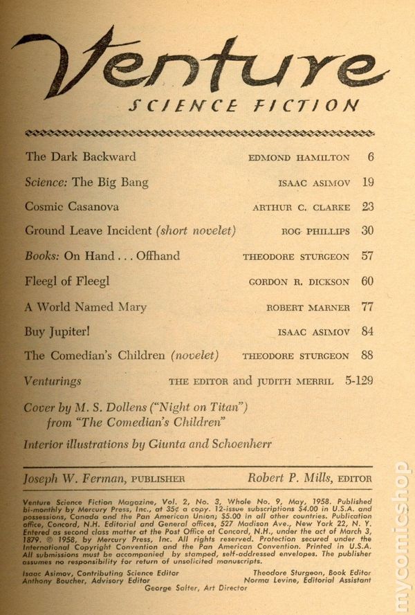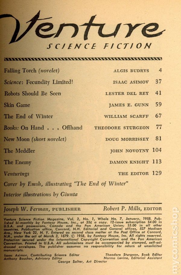 Volume 1, Issue 1, Whole No. 1 - January 1957. Cover by Emsh. Stories by Poul Anderson, Les Cole, Rose Sharon, Isaac Asimov, John Jakes, Charles Beaumont, Theodore Sturgeon. Illustrations by Emsh, John Guinta. Softcover, 5 1/2-in. x 7 3/4-in., 130 pages, Text (with B&W illustrations) Cover price $0.35.
