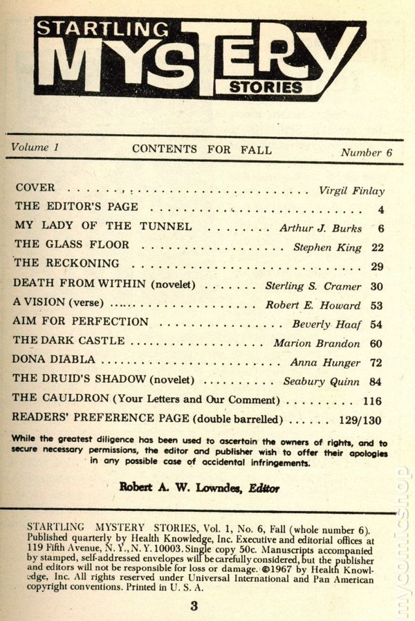 Volume 1, Issue 6. First professional publication of Stephen King with the story "The Glass Floor". Cover price $0.50.