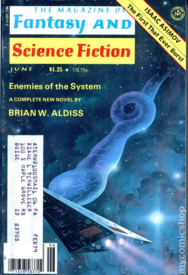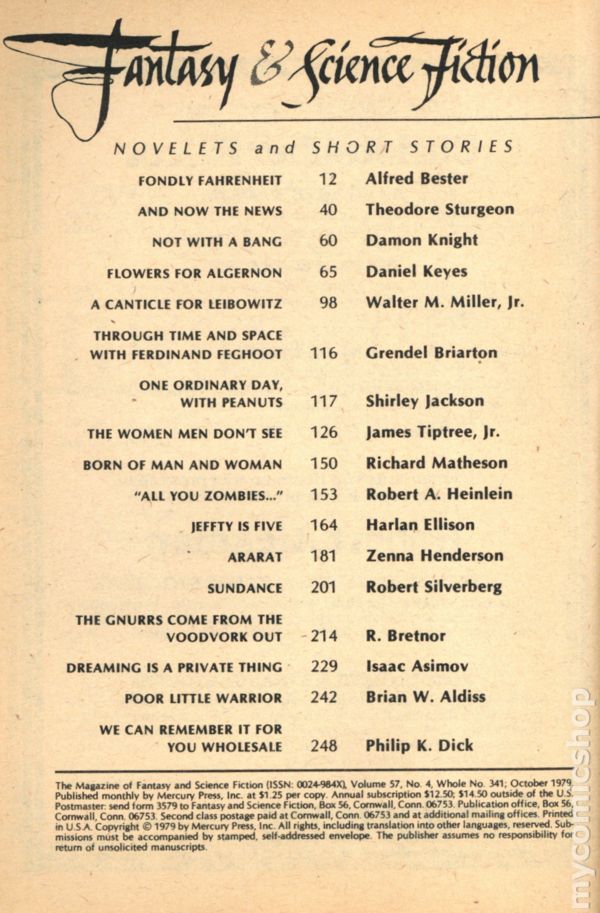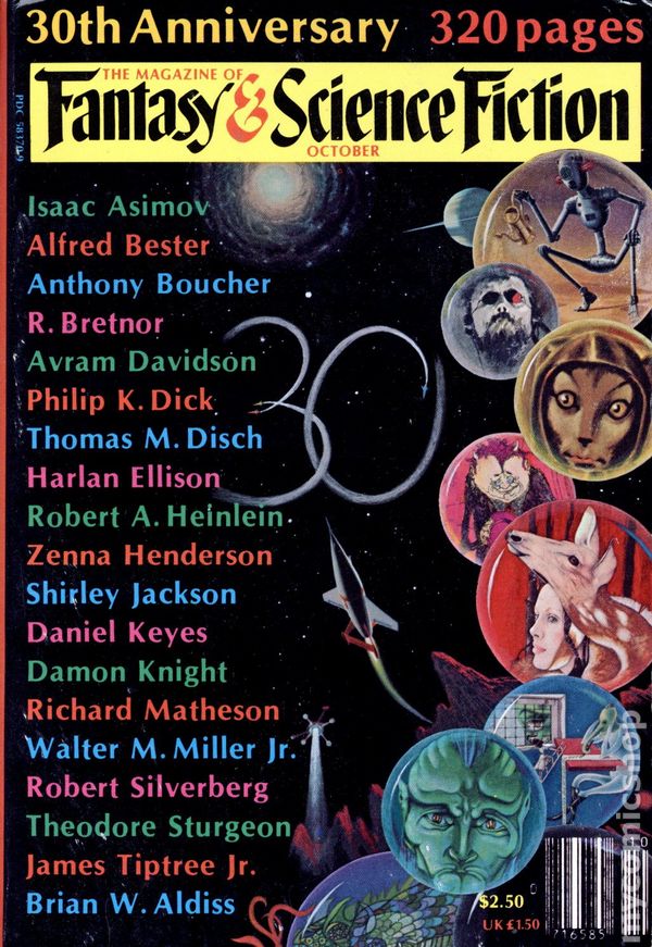Volume 57, Issue 4 - October 1979. 30th Anniversary Issue. Cover by Tom Bevans. Fantasy and science fiction stories by Isaac Awsimov, Alfred Bester, Anthony Boucher, R. Bretnor, Avram Davidson, Philip K. Dick, Thomas M. Disch, Harlan Ellison, Robert A. Heinlein, Zenna Henderson, Shirley Jackson, Daniel Keyes, Damon Knight, Richard Matheson, Walter M. Miller Jr., Robert Silverburg, Theodore Sturgeon, Jame Tiptree Jr, and Brian W. Aldiss. 5 1/2-in. x 7 1/2-in., 162 pages, B&W Cover price $1.25.