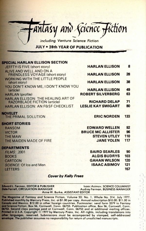 Volume 53, Issue 1 - July 1977. Special Harlan Ellison issue. Includes three stories and an article by Harlan Ellison, articles about Harlan Ellison, and Fantasy and Science Fiction stories by Eric Norden, Edward Wellen, Bruce McAllister, Steven Utley and Jane Yolen. Science article by Isaac Asimov. Softcover. 5-in. x 7-in., 162 pages, Text (with B&W illustrations). Cover price $1.00.