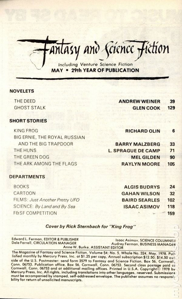 Volume 54, Issue 5 - May 1978. Cover by Rick Sternbach. Fantasy and science fiction stories by Andrew Weiner, Glen Cook, Richard Olin, Barry Malzberg, L. Sprague De Camp, Mel Gilden, Raylyn Moore. 5-in. x 7-in., 162 pages, Text (with B&W illustrations). Cover price $1.25.