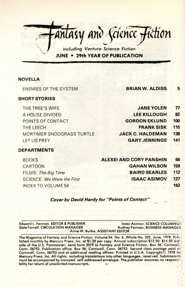 Volume 54, Issue 6 - June 1978. Cover by David Hardy. Fantasy and science fiction stories by Brian W. Aldiss, Jane Yolen, Lee Killough, Gordon Eklund, Frank Sisk, Jack C. Haldeman and Gary Jennings. 5-in. x 7-in., 162 pages, Text (with B&W illustrations). Cover price $1.25.