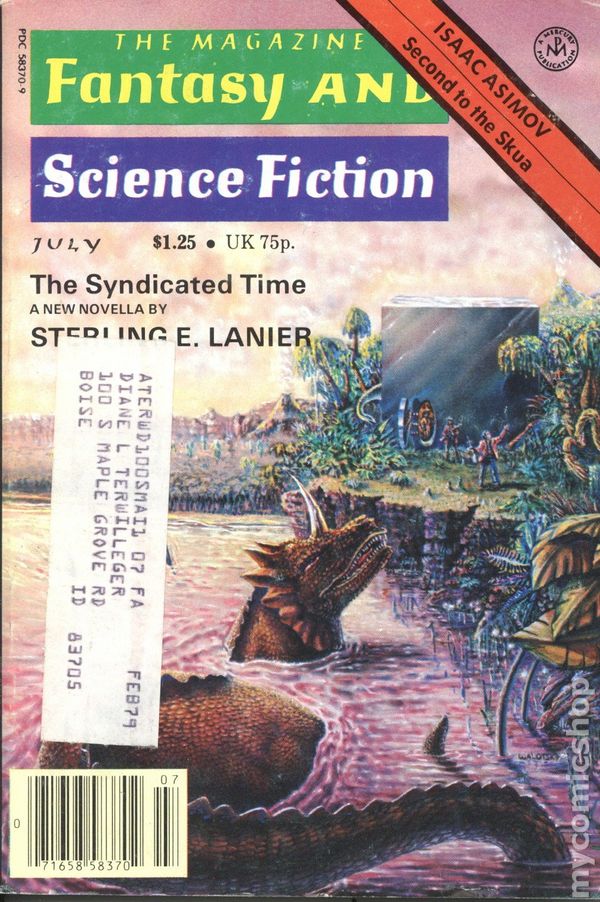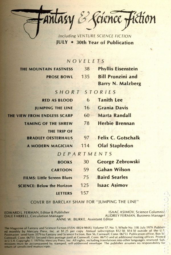 Volume 57, Issue 1 - July 1979. Cover by Barclay Shaw. Fantasy and science fiction stories by Phyllis Eisenstein, Bill Pronzini, Barry N. Malzberg, Tanith Lee, Grania Davis, Marta Randall, Herbie Brennan, Felix C. Gotschalk and Olaf Stapledon. Science article by Isaac Asimov. 5-in. x 7-in., 162 pages, Text (with B&W illustrations). Cover price $1.25.