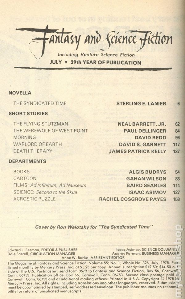 Volume 55, Issue 1 - July 1978. Cover by Ron Walotsky. Fantasy and science fiction stories by Sterling E. Lanier, Neal Barrett Jr., Paul Dellinger, David Redd, David S. Garnett, and James Patrick Kelly. 5 1/2-in. x 7 1/2-in., 162 pages, B&W Cover price $1.25.