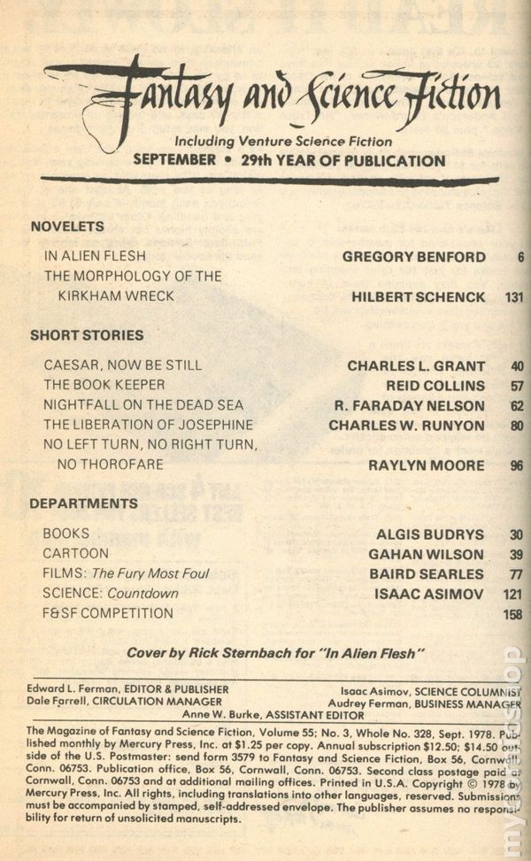 Volume 55, Issue 3 - September 1978. Cover by Rick Sternbach. Fantasy and science fiction stories by Gregory Benford, Hilbert Schenk, Charles L. Grant, Reid Collins, R. Faraday Nelson, Charles W. Runyon and Raylyn Moore. Science article by Isaac Asimov. 5-in. x 7-in., 162 pages, Text (with B&W illustrations). Cover price $1.25.