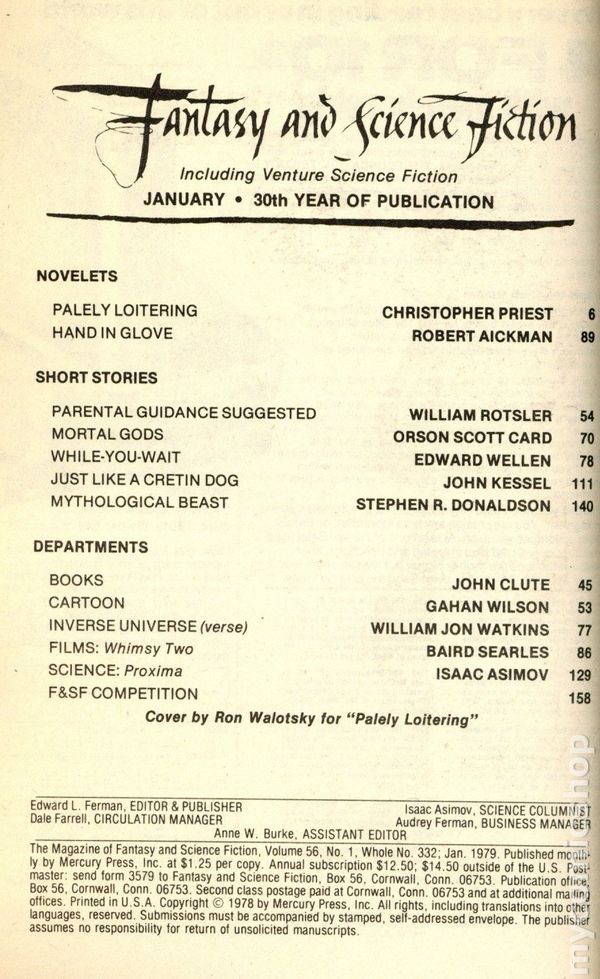 Volume 56, Issue 1 - January 1979. Cover by Ron Walotsky. Fantasy and science fiction stories by Christopher Priest, Robert Aickman, William Rotsler, ORson Scott Card, Edward Wellen, John Kessel, and Stephen R. Donaldson. 5 1/2-in. x 7 1/2-in., 162 pages, B&W Cover price $1.25.