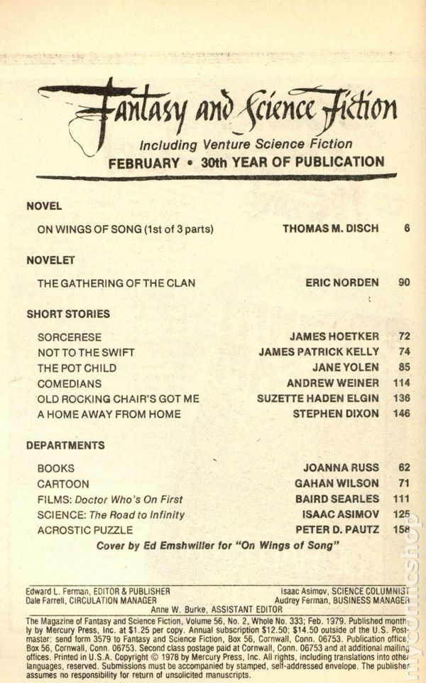 Volume 56, Issue 2 - February 1979. Cover by Ed Emshwiller. Fantasy and science fiction stories by Thomas M. Disch, Eric Norden, James Hoetker, James Patrick Kelly, Jane Yolen, Andrew Weiner, Suzette Haden Elgin, and Stephen Dixon. 5-in. x 7-in., 162 pages, Text (with B&W illustrations). Cover price $1.25.